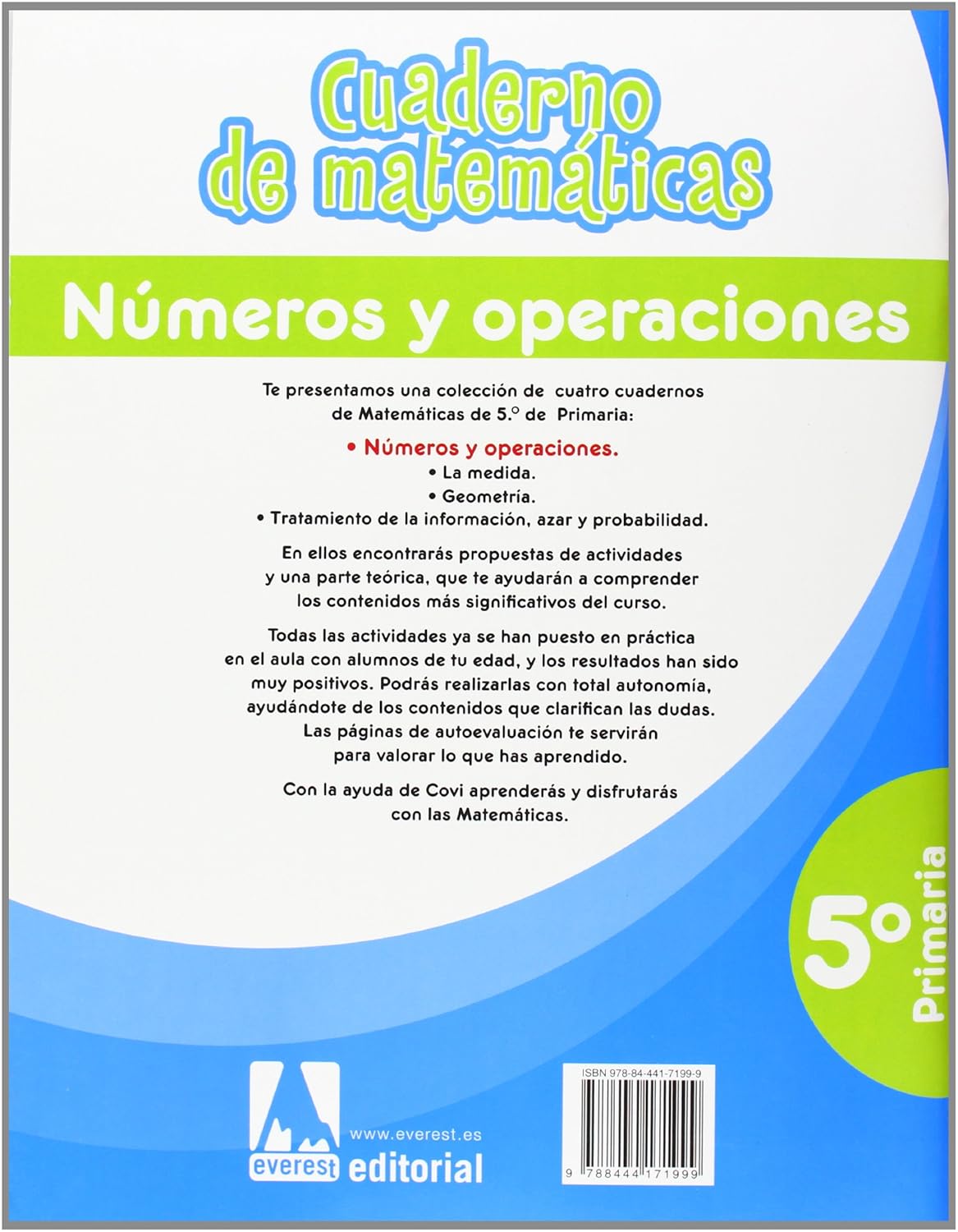 Te presentamos una colección de cuatro cuadernos de Matemáticas de 5º de Primaria. -Números y Operaciones. -La Medida. -Geometría. -Tratamiento de la información, azar y probabilidad. En ellos encontrarás propuestas de actividades y una parte teórica, que te ayudarán a comprender los contenidos más significativos del curso. Todas las actividades ya se han puesto en práctica en el aula con alumnos de tu edad, y los resultados han sido muy positivos. Podrás realizarlas con total autonomía, ayudándote de los contenidos que clarifican las dudas. Las páginas de autoevaluación te servirán para valorar lo que has aprendido. Con la ayuda de Covi aprenderás y disfrutarás con las Matemáticas.