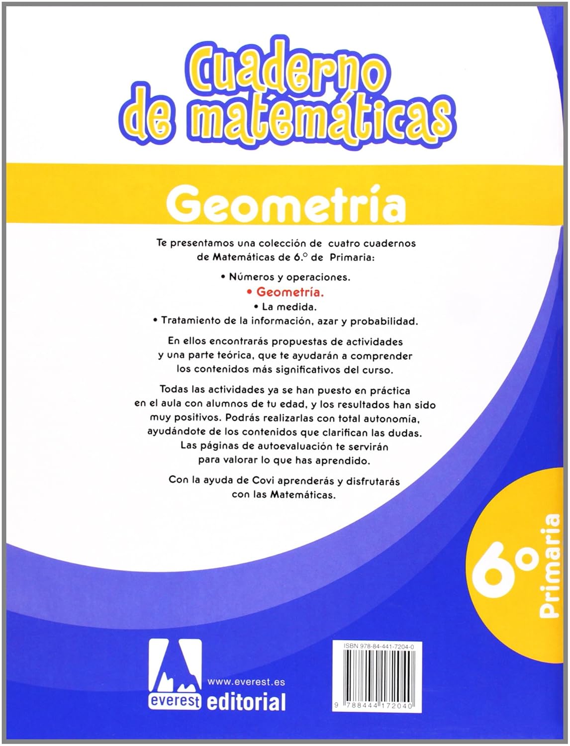 Te presentamos una colección de cuatro cuadernos de Matemáticas de 6º de Primaria. -Números y Operaciones. -La Medida. -Geometría. -Tratamiento de la información, azar y probabilidad. En ellos encontrarás propuestas de actividades y una parte teórica, que te ayudarán a comprender los contenidos más significativos del curso. Todas las actividades ya se han puesto en práctica en el aula con alumnos de tu edad, y los resultados han sido muy positivos. Podrás realizarlas con total autonomía, ayudándote de los contenidos que clarifican las dudas. Las páginas de autoevaluación te servirán para valorar lo que has aprendido. Con la ayuda de Covi aprenderás y disfrutarás con las Matemáticas.