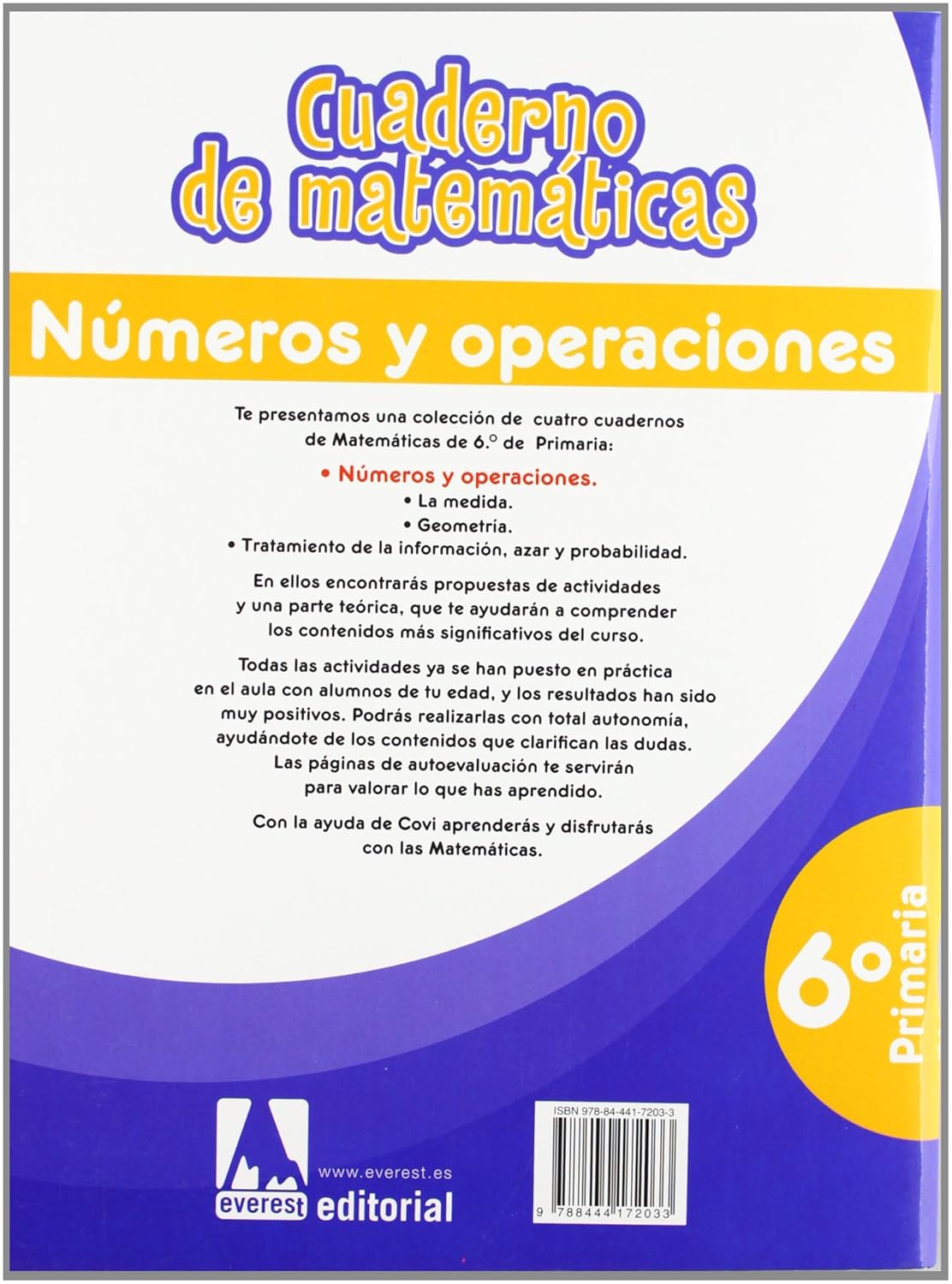 Te presentamos una colección de cuatro cuadernos de Matemáticas de 6º de Primaria. -Números y Operaciones. -La Medida. -Geometría. -Tratamiento de la información, azar y probabilidad. En ellos encontrarás propuestas de actividades y una parte teórica, que te ayudarán a comprender los contenidos más significativos del curso. Todas las actividades ya se han puesto en práctica en el aula con alumnos de tu edad, y los resultados han sido muy positivos. Podrás realizarlas con total autonomía, ayudándote de los contenidos que clarifican las dudas. Las páginas de autoevaluación te servirán para valorar lo que has aprendido. Con la ayuda de Covi aprenderás y disfrutarás con las Matemáticas.