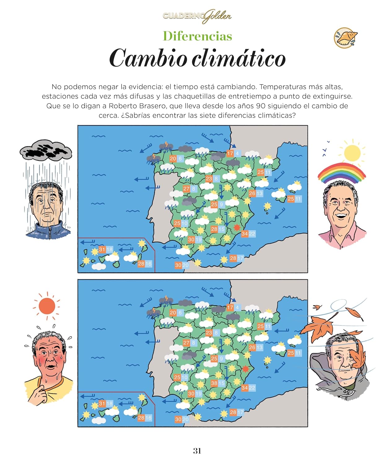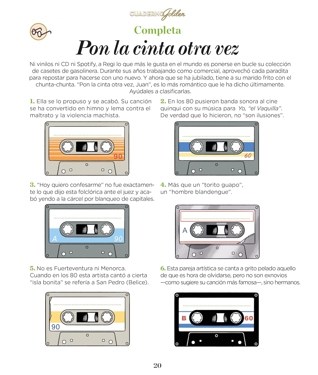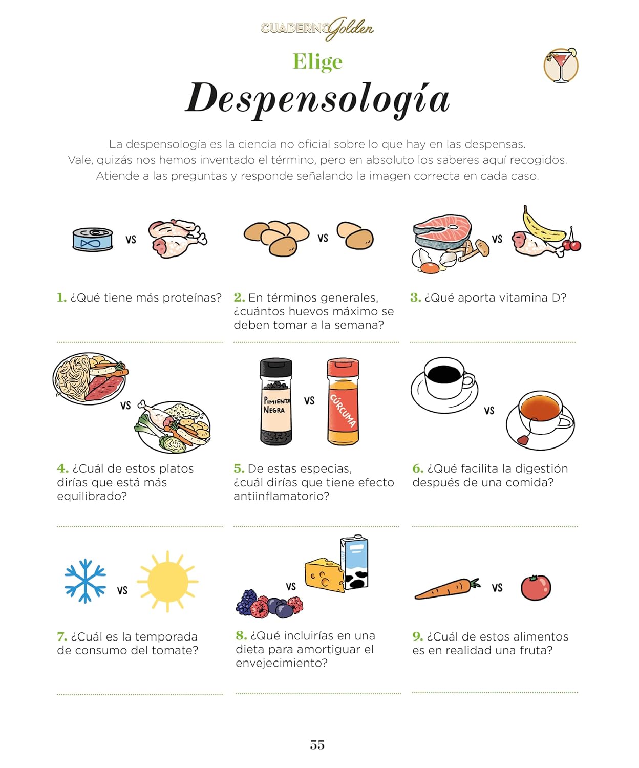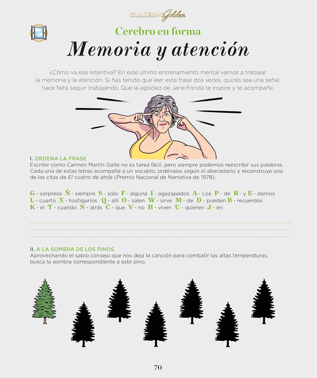 Por fin el primer Cuaderno de actividades pensado para la generación Golden, para los más experimentados (de más edad, dirán algunos) que quieren disfrutar al máximo de su tiempo libre. El CUADERNO GOLDEN ofrece pasatiempos, ejercicios de lógica, sopas de letras, sudokus, test, crucigramas pensados con la ayuda de expertos, para mantener la mente activa, la memoria en forma y los pies en la tierra. Los ejercicios y juegos están elaborados a partir de múltiples temáticas como el cine, la literatura, la cocina, la historia… y con referentes inolvidables como Serrat, Lola Flores o Julia Otero. Perfecto para hacer en la playa, la terraza, de pícnic, de viaje, de relax, con amigos, en pareja, con tus hijos… O para aprovechar ese momentito en el que por fin te quedas a solas, sin ruido ni pantallas. Porque nunca hay que dejar de aprender… ¡ni de divertirse! ENTRENAMIENTO MENTAL Con ejercicios de concentración, lógica y memoria PARA PERSONAS EN LA FLOR DE LA EDAD Para disfrutar del tiempo más libre de nuestras vidas DESCONECTA Y APRENDE SIN PANTALLAS En la playa, en casa, de viaje, en pareja o con amigos POR UN VERANO INOLVIDABLE Porque nunca hay que dejar de aprender… ¡Ni de divertirse! PASATIEMPOS • SOPAS DE LETRAS • CRUCIGRAMAS • JUEGOS DE LÓGICA • SUDOKUS • TEST • AGUDEZA VISUAL • BRAIN TRAINING Este verano te invitamos a que no dejes tus cuadernos en casa y los saques a pasear: ¡Es cuando más se disfrutan! En la playa, en la piscina, de viaje, en un pícnic, en el parque, en una terraza…