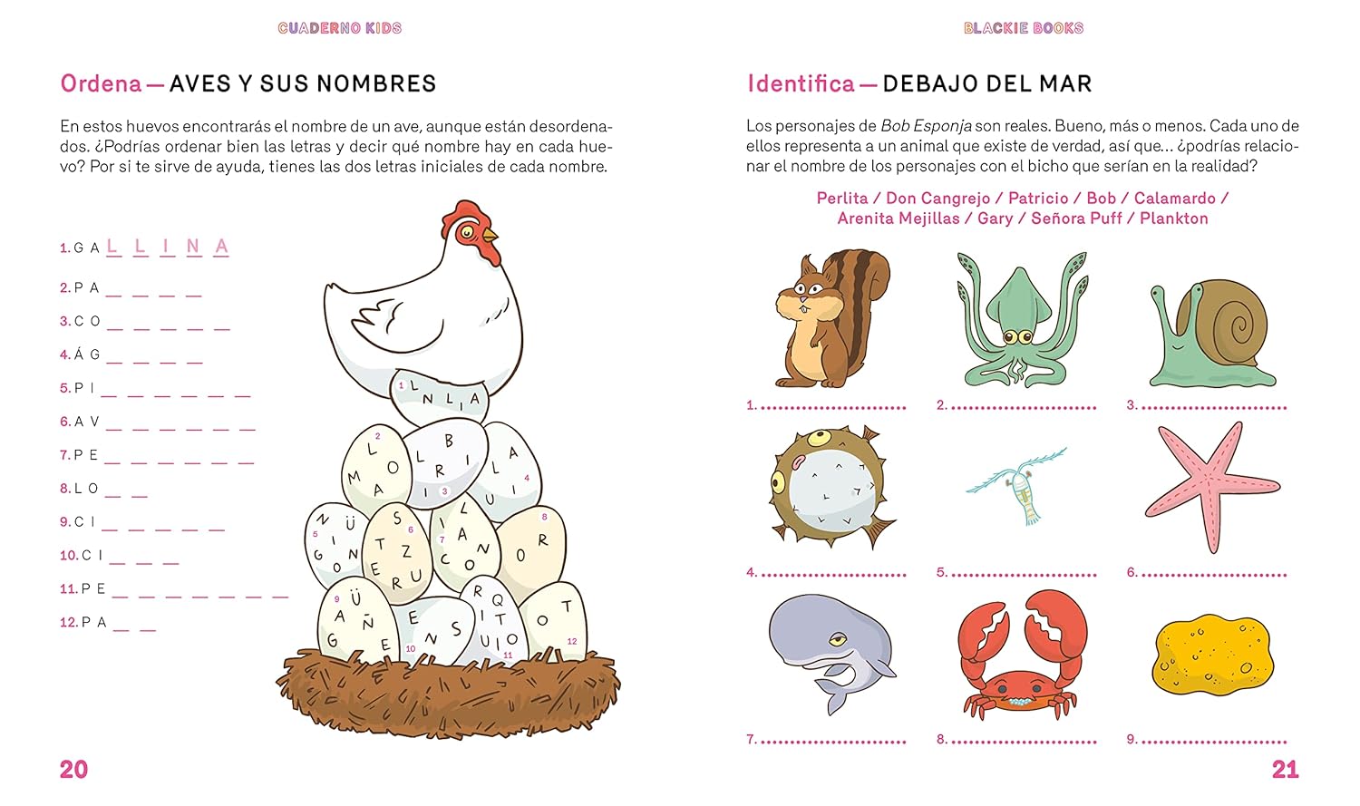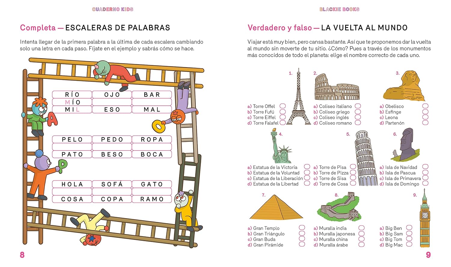 ¡El primer CUADERNO Blackie para niñas y niños! Para divertirse aprendiendo y ejercitando la mente. EN ESTE CUADERNO: Escaparás de laberintos Resolverás enigmas Aprenderás curiosidades increíbles sobre animales Pondrás a prueba tus conocimientos de cine, dibujos animados y superhéroes Completarás crucigramas y anagramas Descubrirás cosas asombrosas de naturaleza y astronomía Y sobre todo… ¡Te divertirás como nunca! INSTRUCCIONES DE USO: 1. Busca un rincón que te guste 2. Coge tu lápiz favorito 3. Pásatelo pipa aprendiendo y retando a tu cerebro