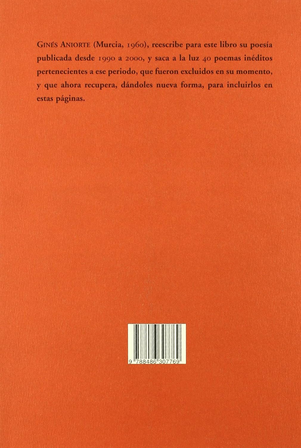 Ginés Aniorte (Murcia, 196o), reescribe para este libro su poesía publicada desde 1990 a 2000, y saca a la luz 40 poemas inéditos pertenecientes a ese periodo, que fueron excluidos en su momento, y que ahora recupera, dándoles nueva forma, para incluirlos en estas páginas.