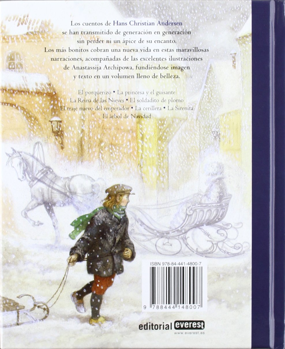 Los cuentos de Hans Christian Andersen se han transmitido de generación en generación sin perder ni un ápice de su encanto. Andersen se muestra de manera fantástica como un autor de cuentos que escribe acerca de sus experiencias personales, dotándolas de un profundo sentido. Sus cuentos hablan de los sentimientos y los deseos; sus protagonistas tienen un corazón que refleja el amor, el dolor, la alegría, la tristeza… Los cuentos seleccionados son los más bonitos y populares de Hans Christian Andersen. Sus personajes cobran una nueva vida envueltos en una maravillosa narración. Las excelentes ilustraciones, llenas de detalles y toques personales de la artista rusa Anastassija Archipowa, constituyen un deleite para todos. Consigue a través del colorido, una veces suave y otras enérgico, transmitir los sentimientos y estados de ánimo propios de cada uno de los personajes. De esta manera, se funden imágenes y textos, haciendo de este libro un tesoro indispensable en cualquier colección de cuentos o biblioteca.