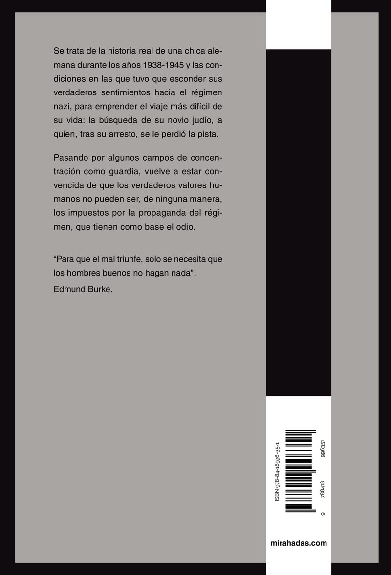 ¿De dónde tanto odio?Se trata de la historia real de una chica alemana durante los años 1938-1945 y las condiciones en las que tuvo que esconder sus verdaderos sentimientos hacia el régimen nazi, para emprender el viaje más difícil de su vida: la búsqueda de su novio judío, a quien, tras su arresto, se le perdió la pista.Pasando por algunos campos de concentración como guardia, vuelve a estar convencida de que los verdaderos valores humanos no pueden ser, de ninguna manera, los impuestos por la propaganda del régimen, que tienen como base el odio.