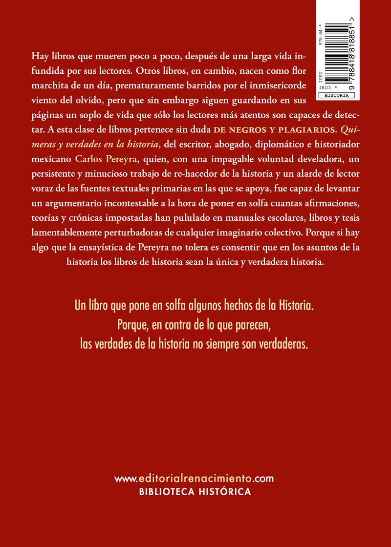 Hay libros que mueren poco a poco, después de una larga vida infundida por sus lectores. Otros libros, en cambio, nacen como flor marchita de un día, prematuramente barridos por el inmisericorde viento del olvido, pero que sin embargo siguen guardando en sus páginas un soplo de vida que sólo los lectores más atentos son capaces de detectar. A esta clase de libros pertenece sin duda De negros y plagiarios. Quimeras y verdades en la historia, del escritor, abogado, diplomático e historiador mexicano Carlos Pereyra, quien, con una impagable voluntad develadora, un persistente y minucioso trabajo de re-hacedor de la historia y un alarde de lector voraz de las fuentes textuales primarias en las que se apoya, fue capaz de levantar un argumentario incontestable a la hora de poner en solfa cuantas afirmaciones, teorías y crónicas impostadas han pululado en manuales escolares, libros y tesis lamentablemente perturbadoras de cualquier imaginario colectivo. Porque si hay algo que la ensayística de Pereyra no tolera es consentir que en los asuntos de la historia los libros de historia sean la única y verdadera historia. Un libro que pone en solfa algunos hechos de la Historia. Porque, en contra de lo que parecen, las verdades de la historia no siempre son verdaderas. Carlos Pereyra (Saltillo, México, 1871-Madrid, 1942). Estudió las primeras letras en su ciudad natal. A los quince años marchó a la capital para cursar Jurisprudencia doctorándose con los máximos honores. Desempeñó cátedras de Historia y Sociología en los colegios de Saltillo. Apenas cumplidos los veinticinco años se entregó de lleno a la política y a la diplomacia. Alternándolas con el derecho y la escritura, Carlos Pereyra, con vocación ambiciosa de historiador, siempre estuvo al servicio de la verdad histórica de América. Y, como es lógico, siendo servidor lealísimo a esta verdad, tuvo que serlo Pereyra de España. De su pluma salieron los libros en que se rehacía la historia de la América española según los planos maestros y con los materiales legítimos. El mito de Monroe, Hernán Cortés, Pizarro, La Obra de España en América, La conquista de las rutas oceánicas, Historia de América, Historia del pueblo americano, El imperio español y tantas más. En ellas vibra una ardiente exaltación españolista y se desvirtúan, con pruebas irrefutables, muchas falsedades relacionadas con el descubrimiento, la conquista y civilización de América por los españoles. Poco a poco, Pereyra fue dedicando la parte más sustanciosa y personal de su talento a la proclamación de su fervor hispano. Abandonó la política y la diplomacia, y casi puede decirse que radicó permanentemente en Madrid. F. S. R. Ricardo Álamo (Sanlúcar de Barrameda, 1965). Licenciado en Filosofía y Ciencias de la Educación por la Universidad de Barcelona. Profesor, escritor y crítico literario. Autor de una obra diversa en la que, a excepción de la novela, casi no hay género que no haya fatigado, desde el microrrelato hasta el ensayo, pasando por la poesía, el aforismo o el dietario. Entre sus últimas publicaciones destacan Plagiarios & Cía. Un diccionario, Letras mínimas, Mil aforismos sobre el amor y otras pasiones o Muchos que me viven, antología poética de Fernando Quiñones, todas ellas en Renacimiento, así como En el nombre del nombre y Ruido y eco.