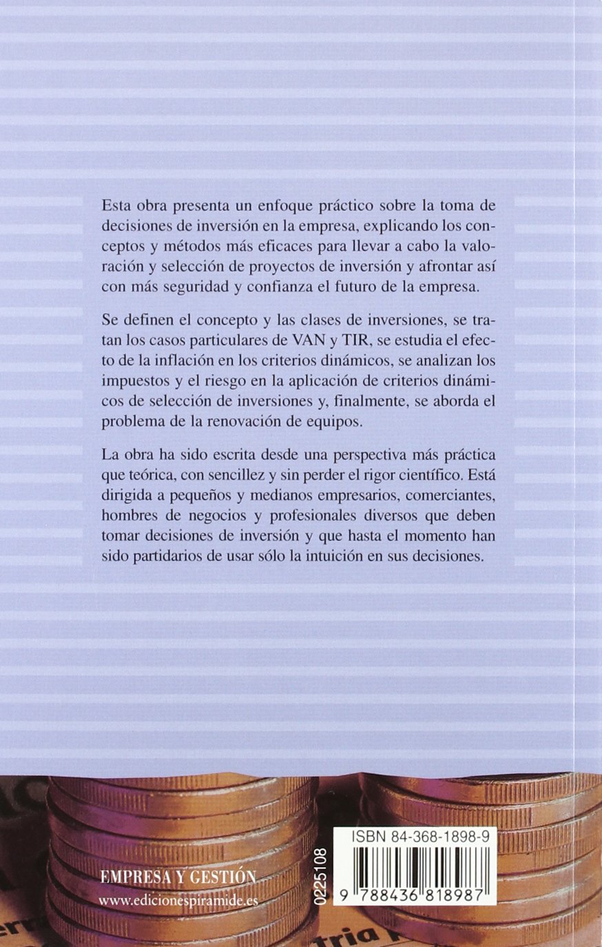 Esta obra presenta un enfoque práctico sobre la toma de decisiones de inversión en la empresa, explicando los conceptos y métodos más eficaces para llevar a cabo la valoración y selección de proyectos de inversión y afrontar así con más seguridad y confianza el futuro de la empresa. Se definen el concepto y las clases de inversiones, se tratan los casos particulares de VAN y TIR, se estudia el efecto de la inflación en los criterios dinámicos, se analizan los impuestos y el riesgo en la aplicación de criterios dinámicos de selección de inversiones y, finalmente, se aborda el problema de la renovación de equipos. La obra ha sido escrita desde una perspectiva más práctica que teórica, con sencillez y sin perder el rigor científico.