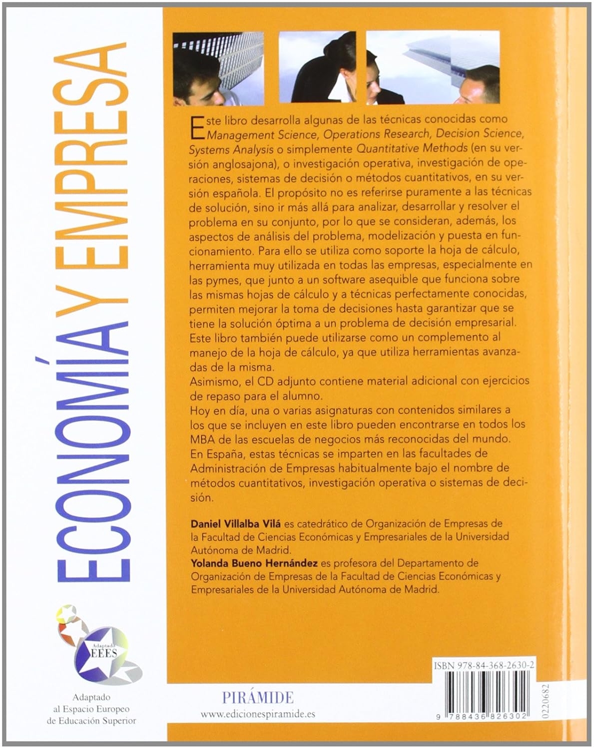 Este libro desarrolla algunas de las técnicas conocidas como Management Science, Operations Research, Decision Science, Systems Analysis o simplemente Quantitative Methods (en su versión anglosajona), o investigación operativa, investigación de operaciones, sistemas de decisión o métodos cuantitativos, en su versión española. El propósito no es referirse puramente a las técnicas de solución, sino ir más allá para analizar, desarrollar y resolver el problema en su conjunto, por lo que se consideran, además, los aspectos de análisis del problema, modelización y puesta en funcionamiento. Para ello se utiliza como soporte la hoja de cálculo, herramienta muy utilizada en todas las empresas, especialmente en las pymes, que junto a un software asequible que funciona sobre las mismas hojas de cálculo y a técnicas perfectamente conocidas, permiten mejorar la toma de decisiones hasta garantizar que se tiene la solución óptima a un problema de decisión empresarial.Este libro también puede utilizarse como un complemento al manejo de la hoja de cálculo, ya que utiliza herramientas avanzadas de la misma. Asimismo, el CD adjunto contiene material adicional con ejercicios de repaso para el alumno. Hoy en día, una o varias asignaturas con contenidos similares a los que se incluyen en este libro pueden encontrarse en todos los MBA de las escuelas de negocios más reconocidas del mundo. En España, estas técnicas se imparten en las facultades de Administración de Empresas habitualmente bajo el nombre de métodos cuantitativos, investigación operativa o sistemas de decisión.