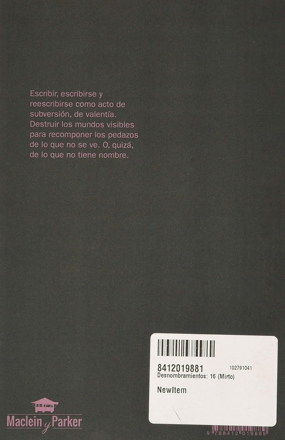 Desnombramientos es el tercer poemario de la consolidada escritora Miriam Palma, en el que utiliza las palabras para crear los espacios literarios de lo que no tiene nombre. Las tres partes en las que está dividido el poemario hablan de amor y desamor, de la creación poética y de la creación del yo, de la capacidad de escribir y reescribir la vida a través de la poesía. La naturaleza de la palabra es aquí telúrica y literaria a la vez, una energía capaz de engendrar lo que se ve, pero también lo que permanece oculto e innombrado. El yo poético late y existe en los versos, de la misma manera que la realidad se hace palpable en cuanto se pronuncia. Hay en estos Desnombramientos una fuerza que destruye lo físico para empezar de cero a través de la palabra y ejercer el derecho a la escritura como un acto de valentía y subversión.