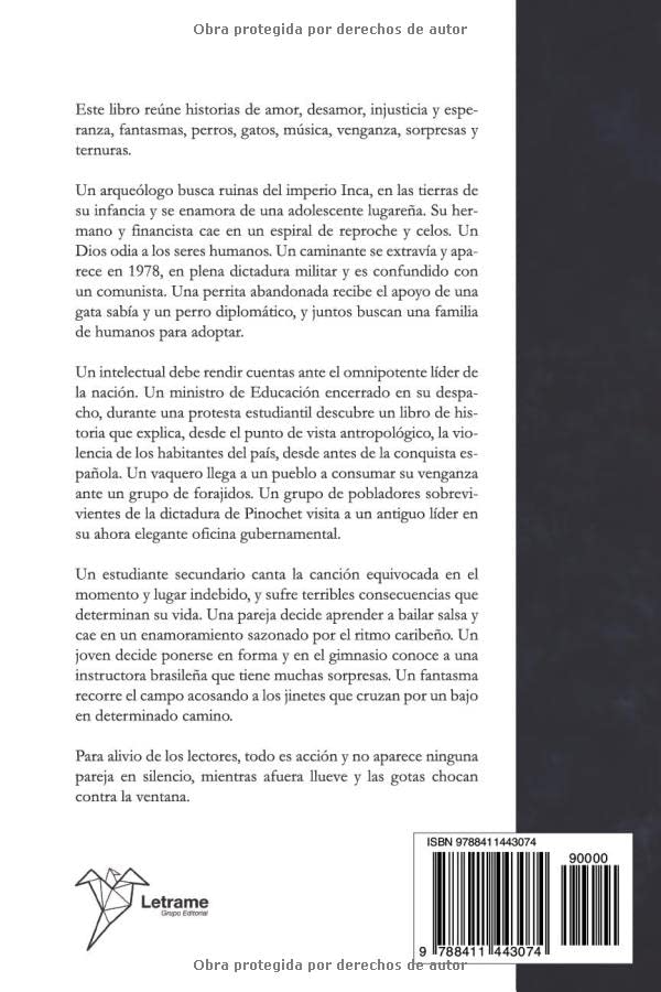 Este libro reúne historias de amor, desamor, injusticia y esperanza, fantasmas, perros, gatos, música, venganza, sorpresas y ternuras.Un arqueólogo busca ruinas del imperio Inca, en las tierras de su infancia y se enamora de una adolescente lugareña. Su hermano y financista cae en un espiral de reproche y celos. Un Dios odia a los seres humanos. Un caminante se extravía y aparece en 1978, en plena dictadura militar y es confundido con un comunista. Una perrita abandonada recibe el apoyo de una gata sabía y un perro diplomático, y juntos buscan una familia de humanos para adoptar.Un intelectual debe rendir cuentas ante el omnipotente líder de la nación. Un ministro de Educación encerrado en su despacho, durante una protesta estudiantil descubre un libro de historia que explica, desde el punto de vista antropológico, la violencia de los habitantes del país, desde antes de la conquista española. Un vaquero llega a un pueblo a consumar su venganza ante un grupo de forajidos. Un grupo de pobladores sobrevivientes de la dictadura de Pinochet visita a un antiguo líder en su ahora elegante oficina gubernamental.Un estudiante secundario canta la canción equivocada en el momento y lugar indebido y sufre terribles consecuencias que determinan su vida. Una pareja decide aprender a bailar salsa y cae en un enamoramiento sazonado por el ritmo caribeño. Un joven decide ponerse en forma y en el gimnasio conoce a una instructora brasileña que tiene muchas sorpresas. Un fantasma recorre el campo acosando a los jinetes que cruzan por un bajo en determinado camino.Para alivio de los lectores, todo es acción y no aparece ninguna pareja en silencio, mientras afuera llueve y las gotas chocan contra la ventana.