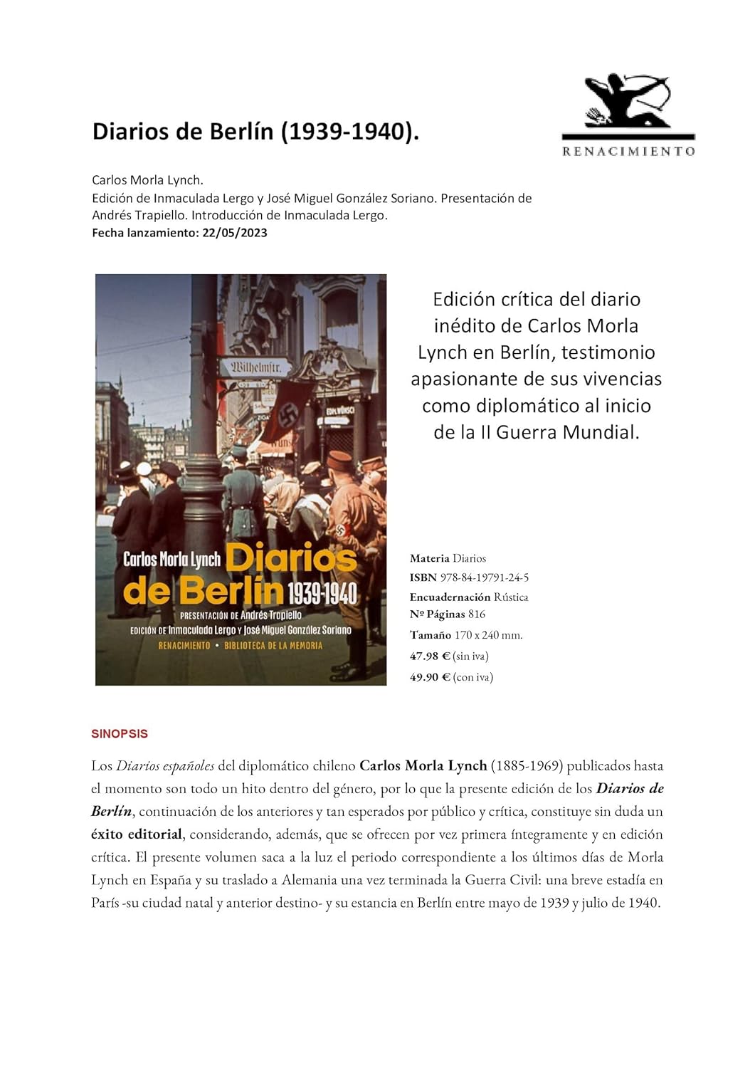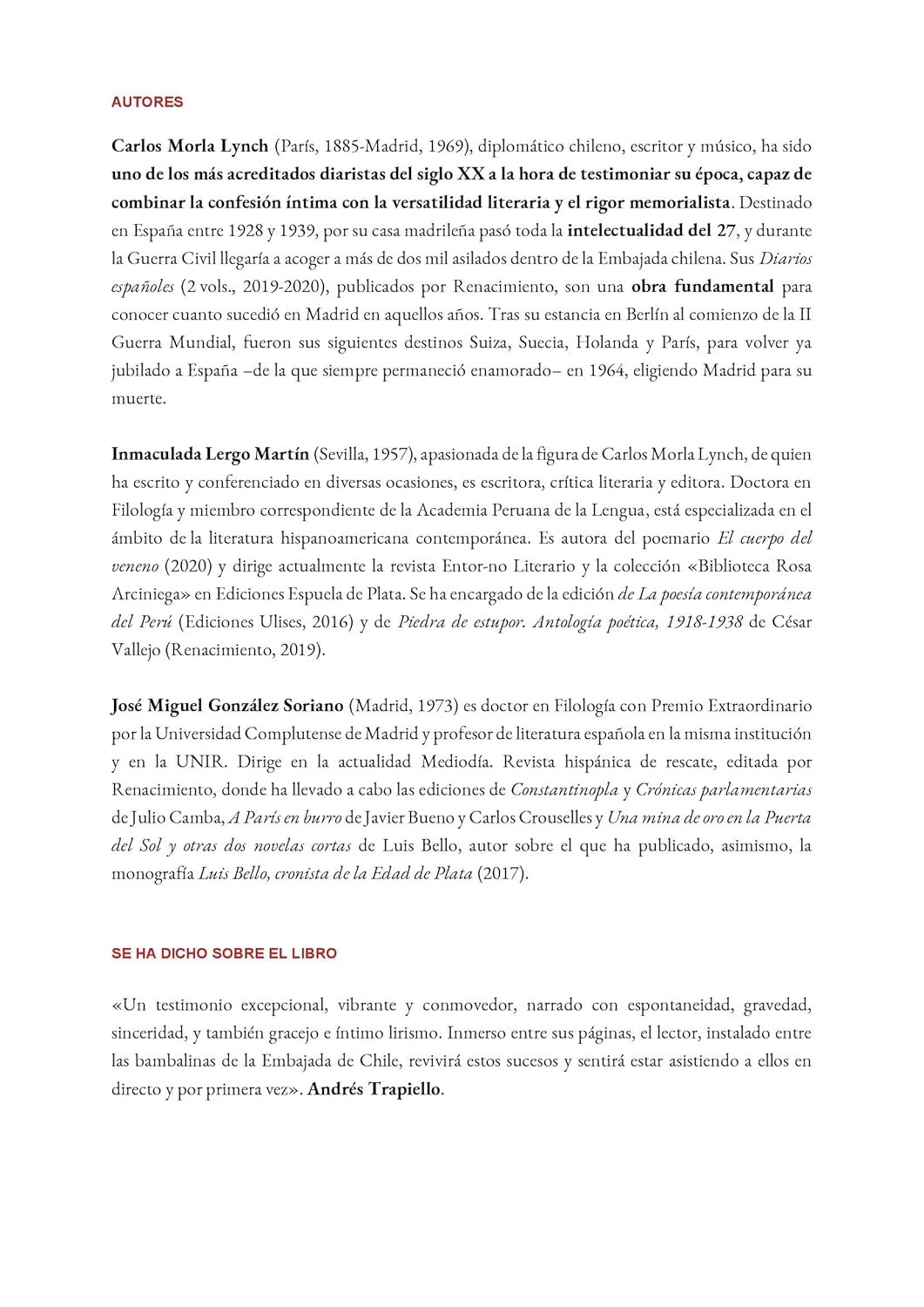 Los Diarios españoles del diplomático chileno Carlos Morla Lynch (1885-1969) publicados hasta el momento (En España con Federico García Lorca y España sufre) son todo un hito dentro del género, por lo que la presente edición de los Diarios de Berlín, continuación de los anteriores y tan esperados por público y crítica, constituye sin duda un éxito editorial, considerando, además, que se ofrecen por vez primera íntegramente y en edición crítica. El presente volumen saca a la luz el periodo correspondiente a los últimos días de Morla Lynch en España y su traslado a Alemania una vez terminada la Guerra Civil: una breve estadía en París –su ciudad natal y anterior destino– y su estancia en Berlín entre mayo de 1939 y julio de 1940, donde le tocó vivir en primera fila, debido a su cargo, el acontecimiento histórico más trascendental de nuestra historia reciente, el tercer Reich y la II Guerra Mundial. Los Diarios de Berlín son un testimonio excepcional, vibrante y conmovedor, narrado con espontaneidad, gravedad, sinceridad, y también gracejo e íntimo lirismo. Inmerso entre sus páginas, el lector, instalado entre las bambalinas de la Embajada de Chile, revivirá estos sucesos y sentirá estar asistiendo a ellos en directo y por primera vez. Edición crítica del diario inédito de Carlos Morla Lynch en Berlín, testimonio apasionante de sus vivencias como diplomático al inicio de la II Guerra Mundial. «Tienes en las manos, lector, lectora, un documento fascinante. Este diario podrás leerlo sin mediaciones ni viciados prejuicios. Será para ti, como lo ha sido para mí, una experiencia única: la de creer que has sido transportado a aquel tiempo y a aquella ciudad en el momento más crucial de su historia, uno de los más decisivos para la Humanidad». Andrés Trapiello Carlos Morla Lynch (París, 1885-Madrid, 1969), diplomático chileno, escritor y músico, ha sido uno de los más acreditados diaristas del siglo XX a la hora de testimoniar su época, capaz de combinar la confesión íntima con la versatilidad literaria y el rigor memorialista. Destinado en España entre 1928 y 1939, por su casa madrileña pasó toda la intelectualidad del 27, y durante la Guerra Civil llegaría a acoger a más de dos mil asilados dentro de la Embajada chilena. Sus Diarios españoles (2 vols., 2019-2020), publicados por Renacimiento, son una obra fundamental para conocer cuanto sucedió en Madrid en aquellos años. Tras su estancia en Berlín al comienzo de la II Guerra Mundial, fueron sus siguientes destinos Suiza, Suecia, Holanda y París, para volver ya jubilado a España –de la que siempre permaneció enamorado– en 1964, eligiendo Madrid para su muerte. Inmaculada Lergo Martín (Sevilla, 1957), apasionada de la figura de Carlos Morla Lynch, de quien ha escrito y conferenciado en diversas ocasiones, es escritora, crítica literaria y editora. Doctora en Filología y miembro correspondiente de la Academia Peruana de la Lengua, está especializada en el ámbito de la literatura hispanoamericana contemporánea. Es autora del poemario El cuerpo del veneno (2020) y dirige actualmente la revista Entorno Literario y la colección «Biblioteca Rosa Arciniega» en Ediciones Espuela de Plata. Se ha encargado de la edición de La poesía contemporánea del Perú (Ediciones Ulises, 2016) y de Piedra de estupor. Antología poética, 1918-1938 de César Vallejo (Renacimiento, 2019). José Miguel González Soriano (Madrid, 1973) es doctor en Filología con Premio Extraordinario por la Universidad Complutense de Madrid y profesor de literatura española en la misma institución y en la UNIR. Dirige en la actualidad Mediodía. Revista hispánica de rescate, editada por Renacimiento, donde ha llevado a cabo las ediciones de Constantinopla y Crónicas parlamentarias de Julio Camba, A París en burro de Javier Bueno y Carlos Crouselles y Una mina de oro en la Puerta del Sol y otras dos novelas cortas de Luis Bello, autor sobre el que ha publicado, asimismo, la monografía Luis Bello, cronista de la Edad de Plata (2017).