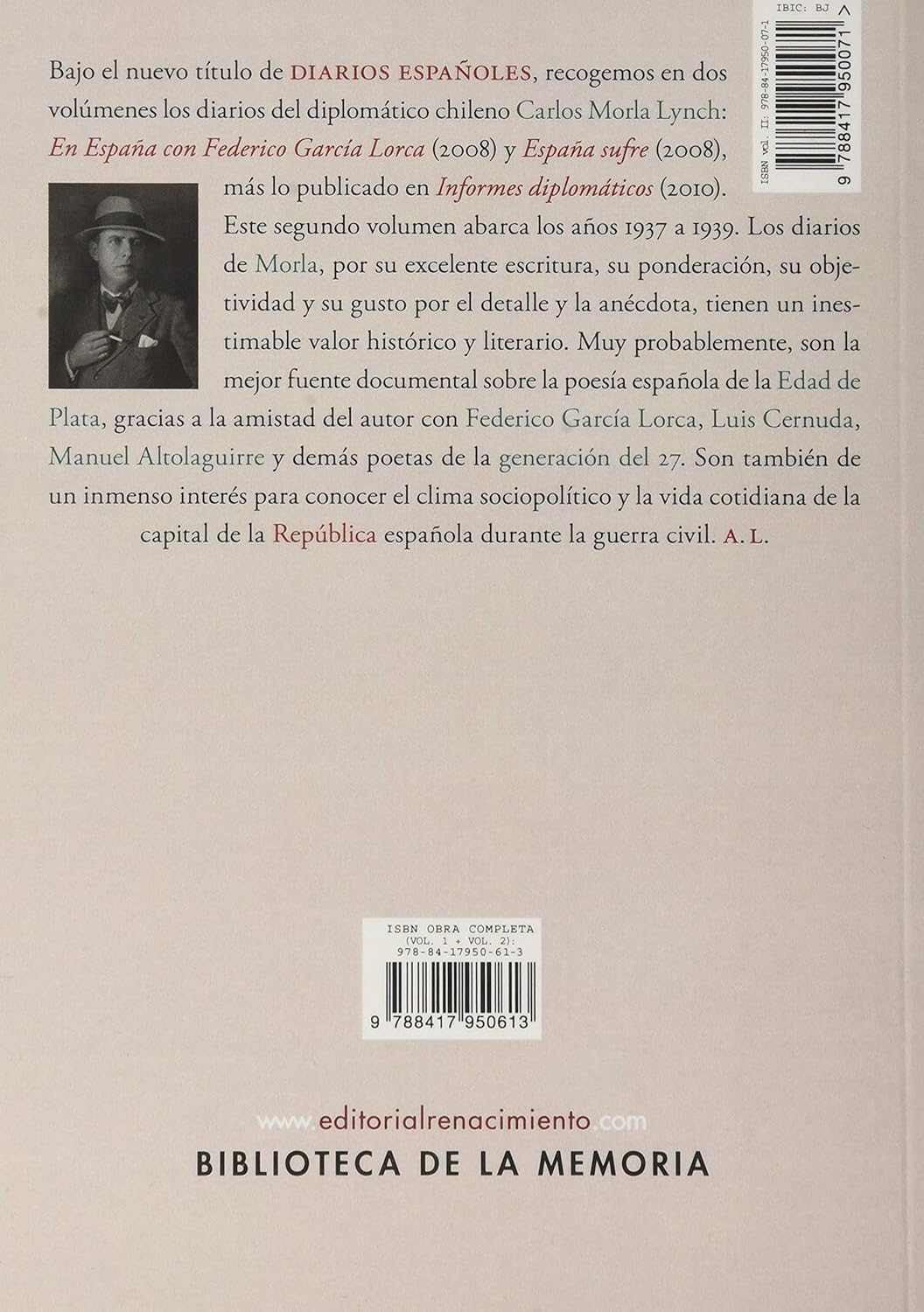 Bajo el nuevo título de Diarios españoles, recogemos en dos volúmenes los diarios del diplomático chileno Carlos Morla Lynch: En España con Federico García Lorca (2008) y España sufre (2008), más lo publicado en Informes diplomáticos (2010). Los diarios de Morla, por su excelente escritura, su ponderación, su objetividad y su gusto por el detalle y la anécdota, tienen un inestimable valor histórico y literario. Muy probablemente, son la mejor fuente documental sobre la poesía española de la Edad de Plata, gracias a la amistad del autor con Federico García Lorca, Luis Cernuda, Manuel Altolaguirre y demás poetas de la generación del 27. Son también de un inmenso interés para conocer el clima sociopolítico y la vida cotidiana de la capital de la República española durante la guerra civil. A. L. La carrera de Carlos Morla Lynch (París, 1885-Madrid, 1969) comenzó en París, donde trabajó como diplomático de la embajada chilena durante los años 1920 a 1928. Fue trasladado a Madrid como encargado de Negocios de la embajada que entonces dirigía Núñez Morgado, aunque su papel fue mucho más importante y decisivo que el de este, pues durante los años de la guerra civil, cientos de personas buscaron refugio en la delegación chilena y pudieron salvarse sólo gracias a la habilidad diplomática de Morla y a su generosidad humana, que supo dejar de lado los intereses de uno y otro bando. Morla además de diplomático fue un hombre de espíritu creativo y sensible a las artes. Desde muy joven comenzó a escribir sus diarios que son ya considerados como documentos imprescindibles para conocer la vida española de aquellos años, pues por sus páginas veremos pasar, sin distinción de clase o profesión, lo mejor de la cultura española de entonces. Estarán la mayoría de los miembros de la generación del 27 (Lorca, Cernuda, Aleixandre, Alberti, Altolaguirre, Gerardo Diego, Salinas, Jorge Guillén…), pero además aparecerán juntos, y a menudo revueltos, otras muchas figuras del toreo o de la canción, también políticos, actores, escritores, aristócratas, pintores, etc., entre los que se encuentran, sólo por mencionar algunos ejemplos, Manuel Azaña, Pablo Neruda, Julián Besteiro, Vicente Huidobro, Alejandro Lerroux, Eugenio d’Ors, La Argentinita, Ignacio Sánchez Mejía, Gabriela Mistral, Fernando de los Ríos, Gitanillo de Triana, Manuel Ángeles Ortiz, el conde de Romanones, Pastora Imperio, La Niña de los Peines y cien más.