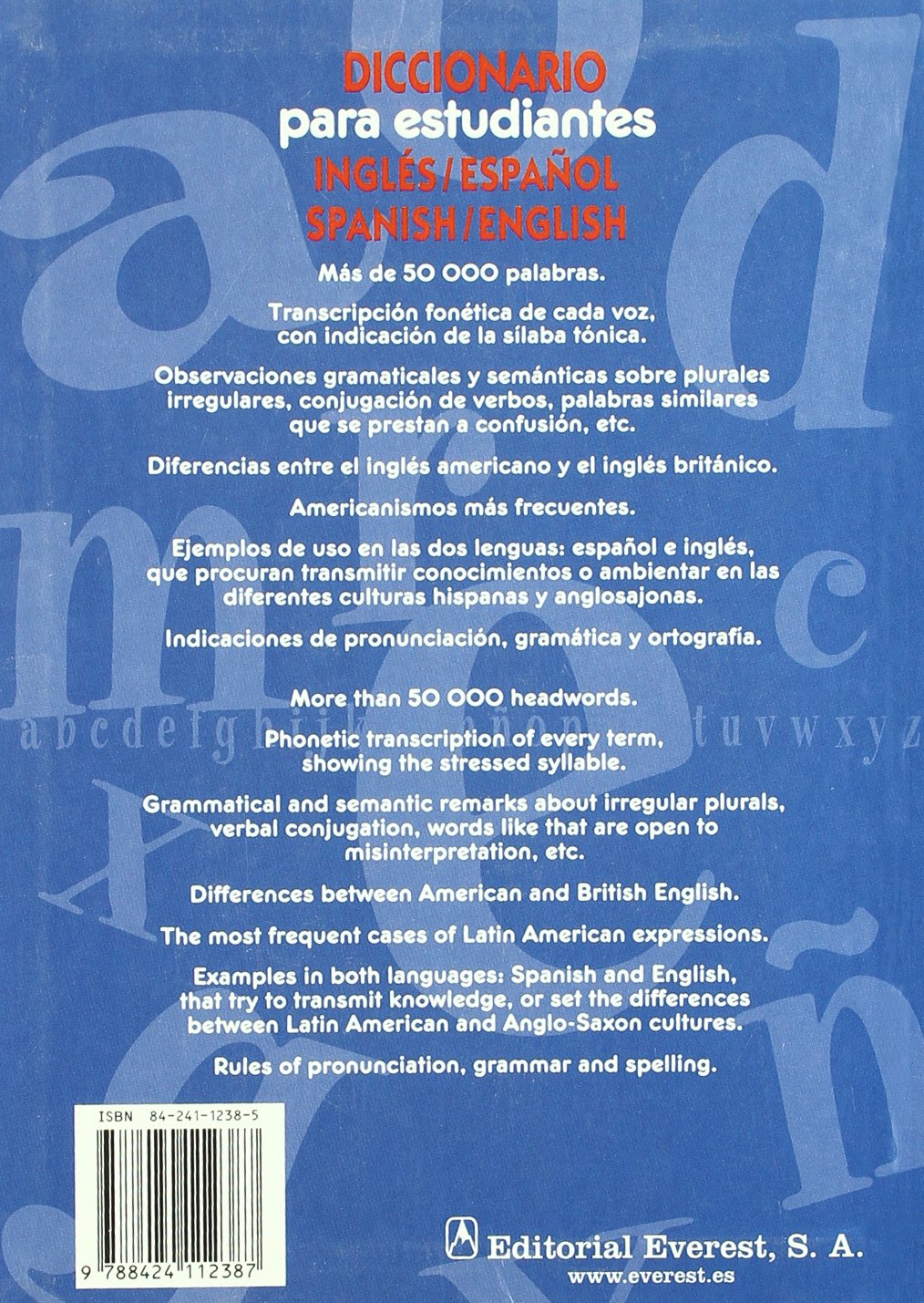 El Diccionario de inglés para estudiantes está especialmente indicado tanto por su uso en situaciones comunicativas básicas dentro del trabajo o la vida diaria, como para solucionar las principales dificultades que conlleva el estudio de una lengua extranjera, para todas aquellas personas con un nivel medio de inglés que desean profundizar en el estudio de dicha lengua. Consta de 50 000 palabras, cada una de ellas con su transcripción fonética y sus definiciones, además de glosas gramaticales (plurales irregulares, femeninos, conjugación irregular, etc ), cuadros, tanto gramaticales (Special Verbs, Question tags, Verbal Aspects, etc) como culturales (fiesta de Halloween, Nursery rhymes, Pantomime, etc), ejemplos e imágenes ilustrativas.