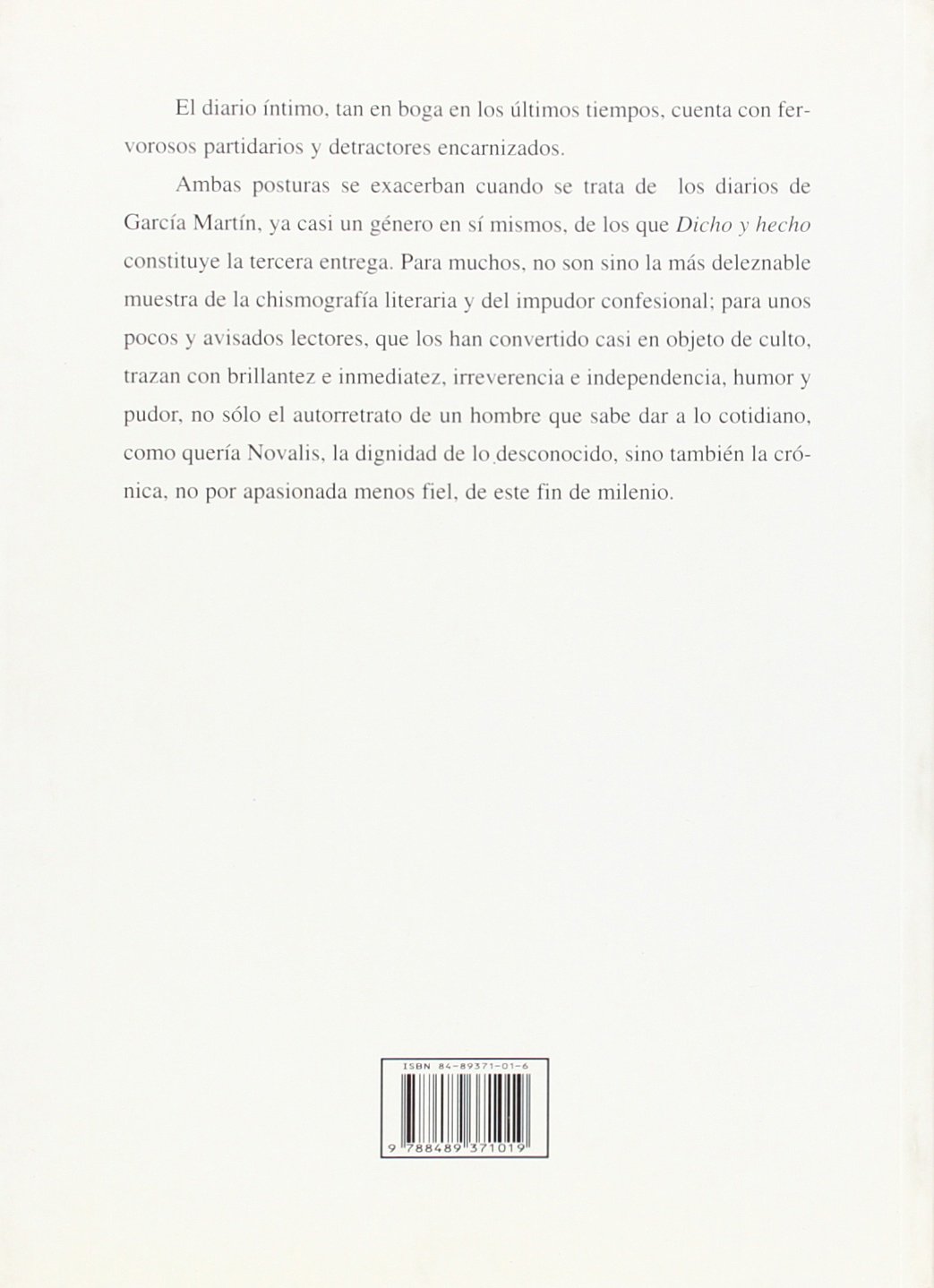 El diario íntimo, tan en boga en los últimos tiempos, cuenta con fervorosos partidarios y detractores encarnizados. Ambas posturas se exacerban cuando se trata de los diarios de García Martín, ya casi un género en sí mismos, de los que Dicho y hecho constituye la tercera entrega. Para muchos, no son sino la más deleznable muestra de la chismografía literaria y del impudor confesional; para unos pocos y avisados lectores, que los han convertido casi en objeto de culto, trazan con brillantez e inmediatez, irreverencia e independencia, humor y pudor, no sólo el autorretrato de un hombre que sabe dar a lo cotidiano, como quería Novalis, la dignidad de lo desconocido, sino también la crónica, no por apasionada menos fiel, de este fin de milenio.