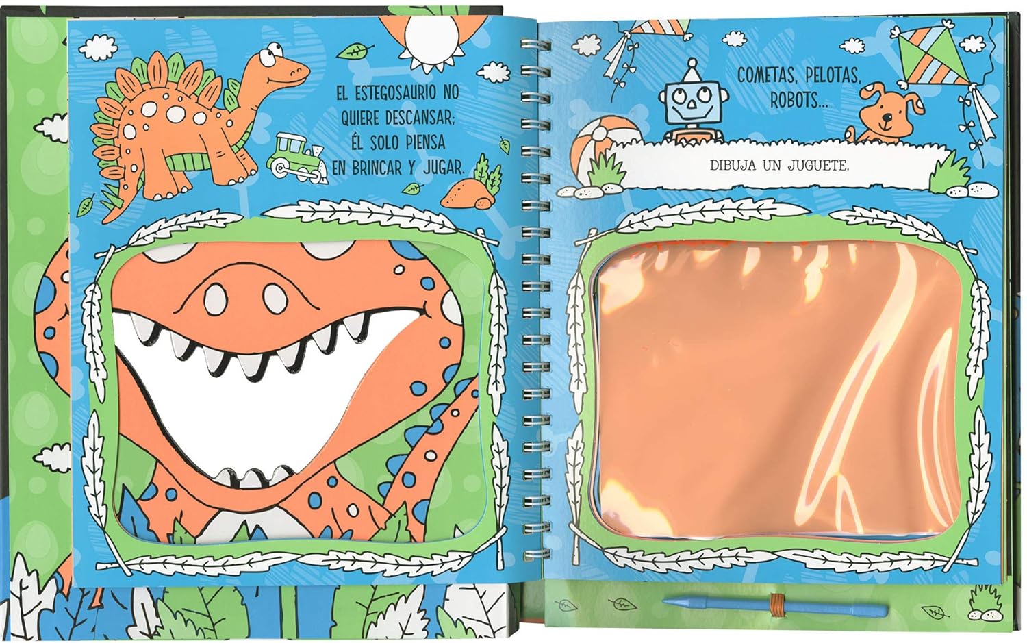 Acompaña a los dinosaurios, disfruta de las rimas y diviértete dibujando en la pizarra mágica. Para borrar, ¡solo tienes que despegar la pizarra y volverla a pegar!