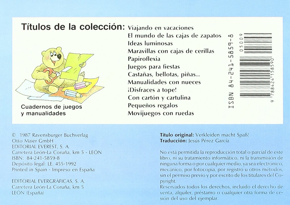 ¡Tengo una idea fantástica! Vamos a vestirnos con ropas de colores y a maquillarnos las caras para tener un aspecto diferente. No tenemos que esperar hasta Carnavales. Disfrazarse es divertido. Te tengo preparado, entre otros, tres maravillosos conjuntos: de hada madrina, de mago y de reina de los mares. ¿O prefieres a los extravagantes payasos? Para la cebra necesitas todo blanco y negro.Pero también te puedes transformar en un pájaro del paraíso o en un escarabajo de la suerte. Hasta una parejita de robots encontrarás entre los atuendos. Al final del cuaderno te muestro cómo convertirte en una flor. ¡Y ahora comencemos! Yo voy de mago, ¿y tú?