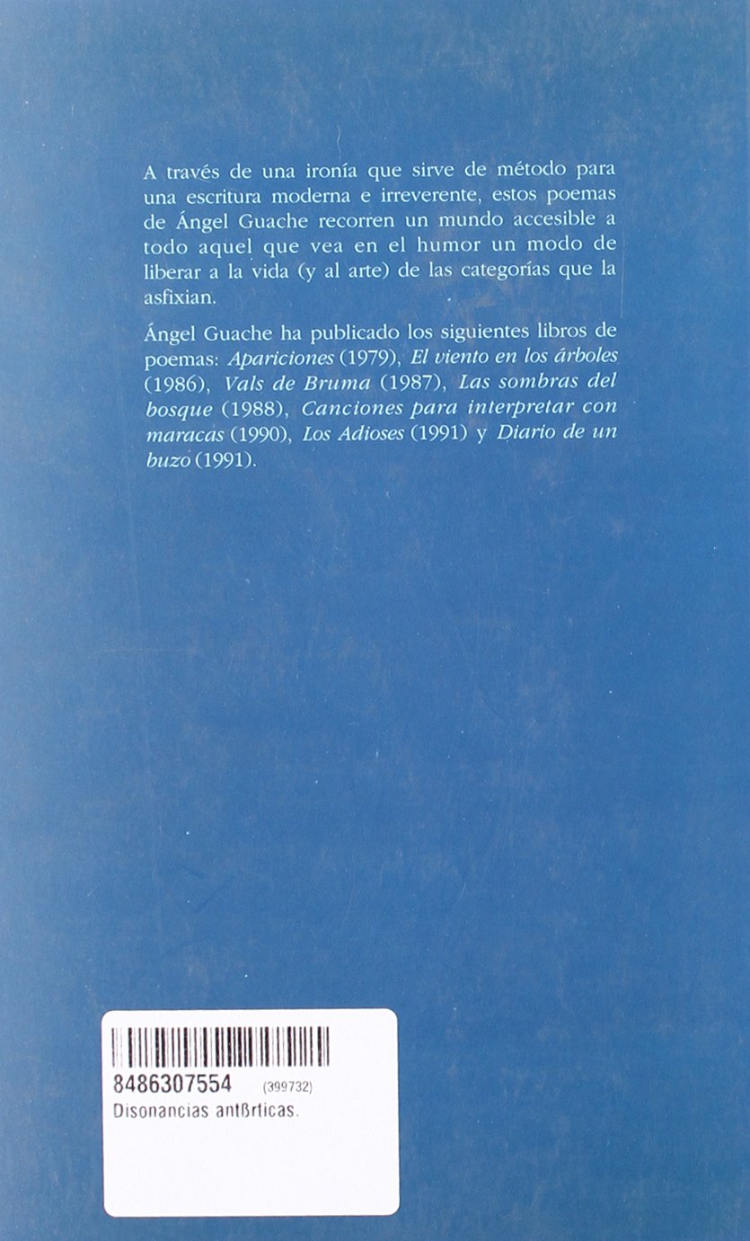 A través de una ironía que sirve de método para una escritura moderna e irreverente, estos poemas de Ángel Guache recorren un mundo accesible a todo aquel que vea en el humor un modo de liberar a la vida (y al arte) de las categorías que la asfixian. Ángel Guache ha publicado los siguientes libros de poemas: Apariciones (1979), El viento en los árboles (1986), Vals de Bruma (1987), Las sombras del bosque (1986), Canciones para interpretar con maracas (1990), Los adioses (1991) y Diario de un buzo (1991).