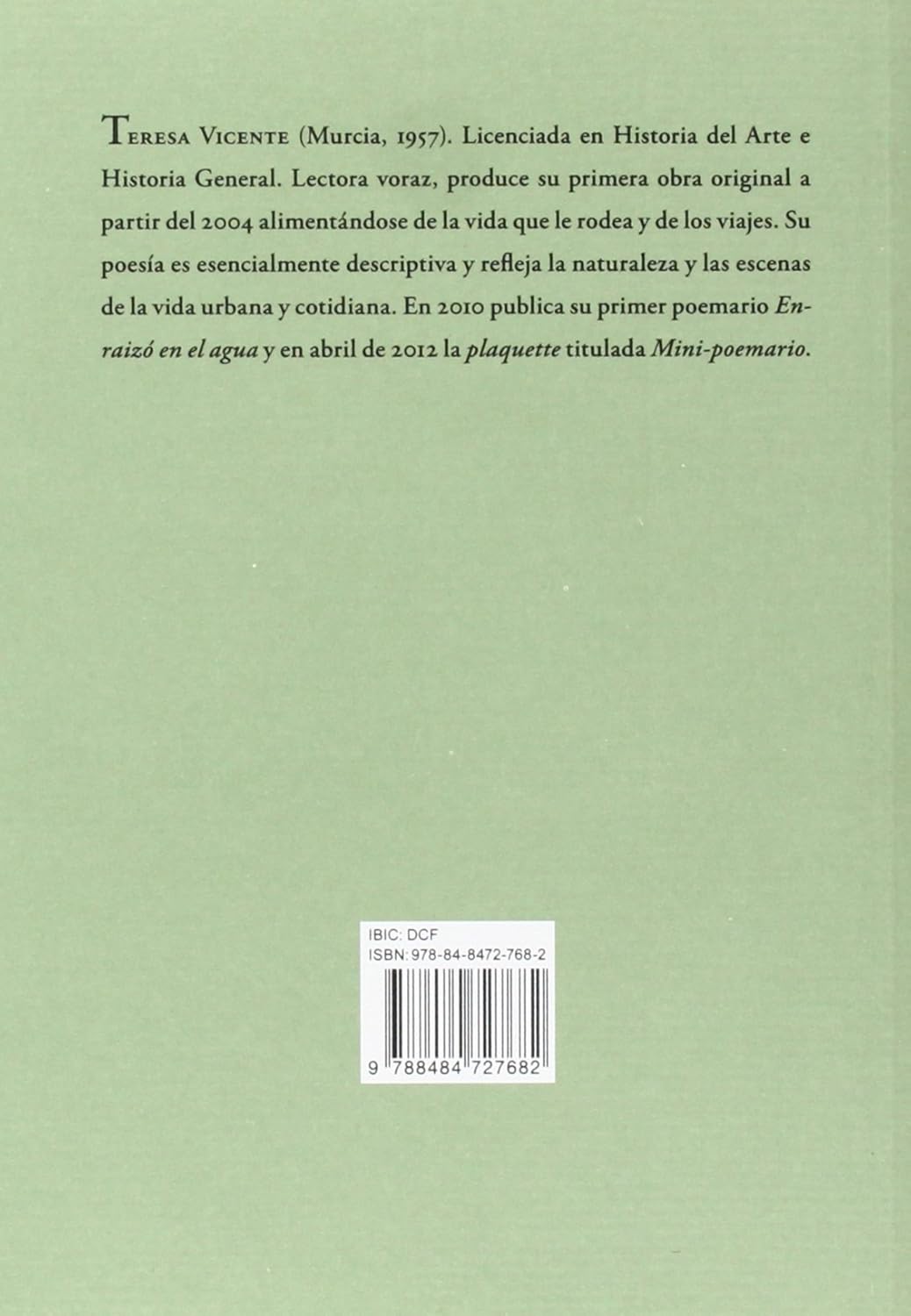 Teresa Vicente (Murcia, 1957). Licenciada en Historia del Arte e Historia General. Lectora voraz, produce su primera obra original a partir del 2004 alimentándose de la vida que le rodea y de los viajes. Su poesía es esencialmente descriptiva y refleja la naturaleza y las escenas de la vida urbana y cotidiana. En 2010 publica su primer poemario Enraizó en el agua y en abril de 2012 la plaquette titulada Mini-poemario.