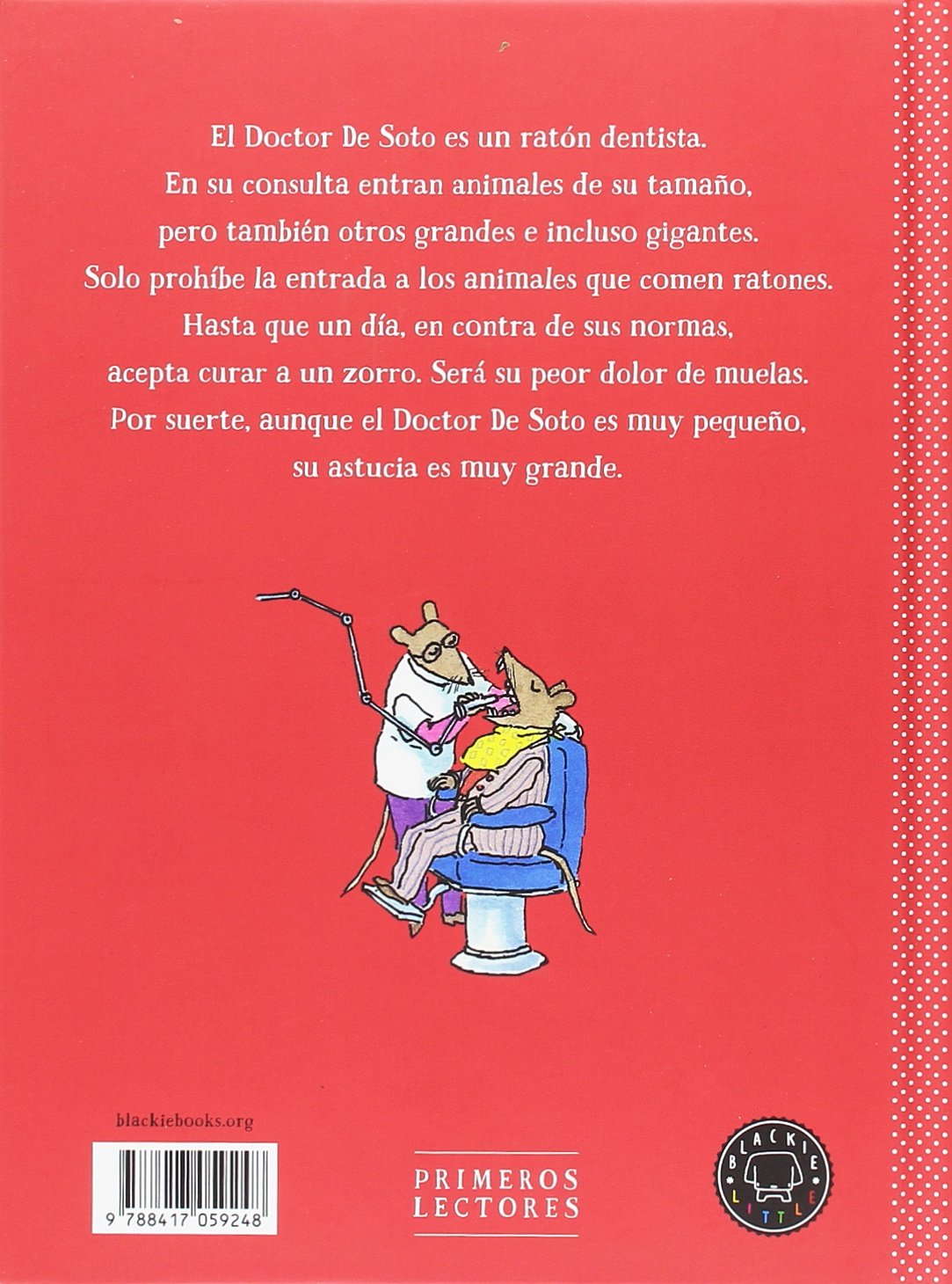 El Doctor De Soto es un ratón dentista. En su consulta entran animales de su tamaño, pero también otros grandes e incluso gigantes. Solo prohíbe la entrada a los animales que comen ratones. Hasta que un día, en contra de sus normas, acepta curar a un zorro. Será su peor dolor de muelas. Por suerte, aunque el Doctor De Soto es muy pequeño, su astucia es muy grande. Una fábula divertidísima que enseña a los más pequeños que sus ideas los harán grandes. Y que se puede ser listo y, además, bueno. Un clásico moderno para primeros lectores.