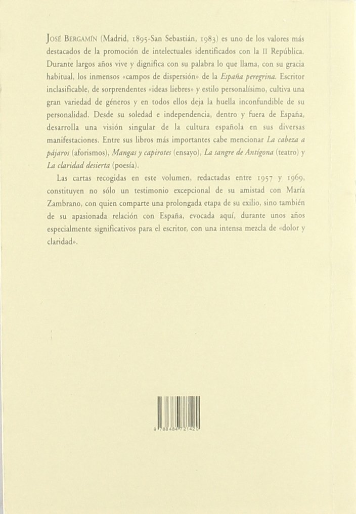 José Bergamín (Madrid, 1895-San Sebastián, 1983) es uno de los valores más destacados de la promoción de intelectuales identificados con la II República. Durante largos años vive y dignifica con su palabra lo que llama, con su gracia habitual, los inmensos «campos de dispersión» de la España peregrina. Escritor inclasificable, de sorprendentes «ideas liebres., y estilo personalísimo, cultiva una gran variedad de géneros y en todos ellos deja la huella inconfundible de su personalidad. Desde su soledad e independencia, dentro y fuera de España, desarrolla una visión singular de la cultura española en sus diversas manifestaciones. Entre sus libros más importantes cabe mencionar La cabeza a pájaros (aforismos), Mangas y capirotes (ensayo), La sangre de Antígona (teatro) y La claridad desierta (poesía). Las cartas recogidas en este volumen, redactadas entre 1957 y 1969, constituyen no sólo un testimonio excepcional de su amistad con María Zambrano, con quien comparte una prolongada etapa de su exilio, sino también de su apasionada relación con España, evocada aquí, durante unos años especialmente significativos para el escritor, con una intensa mezcla de «dolor y claridad».