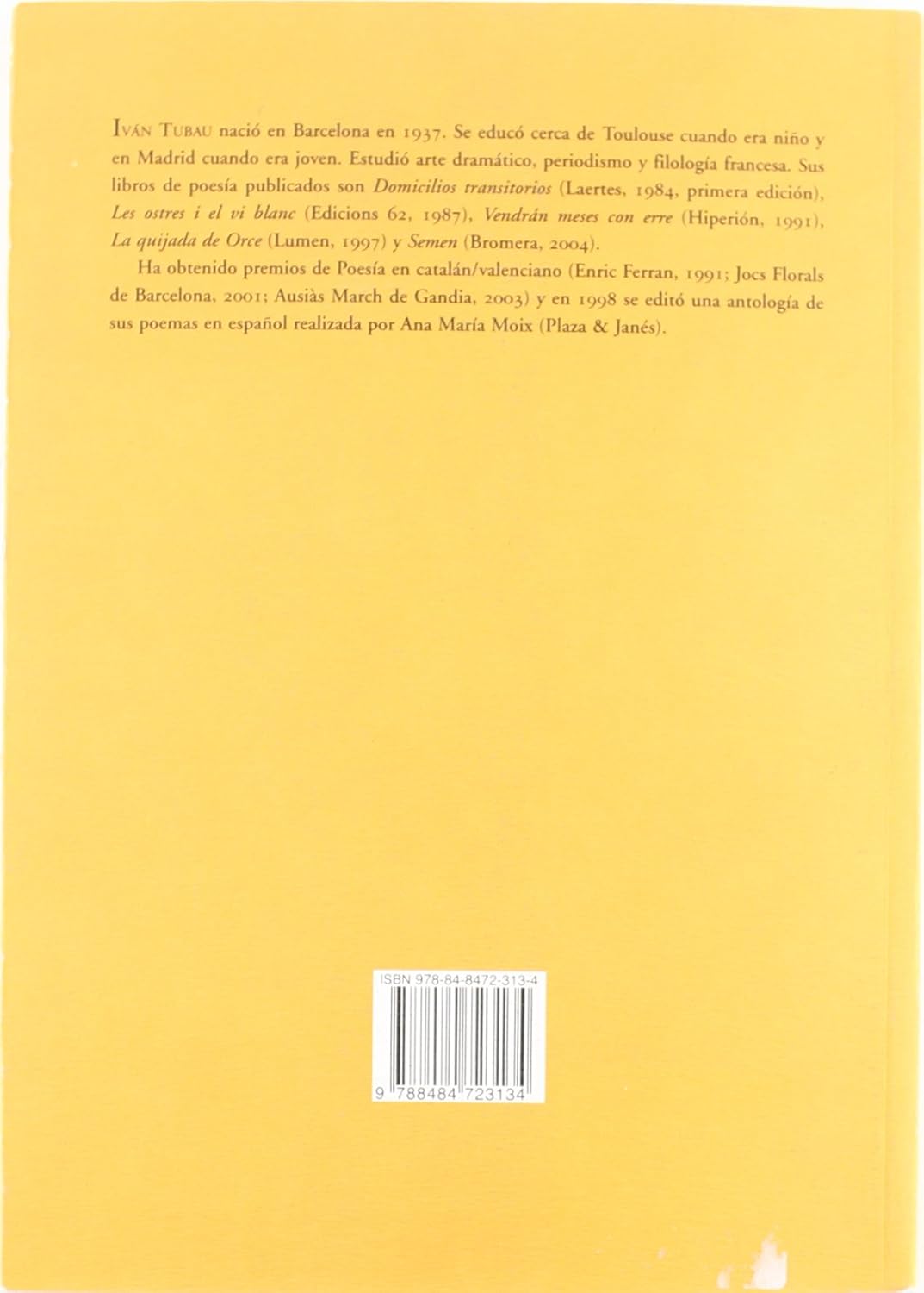 Iván Tubau nació en Barcelona en 1937. Se educó cerca de Toulouse cuando era niño y en Madrid cuando era joven. Estudió arte dramático, periodismo y filología francesa. Sus libros de poesía publicados son Domicilios transitorios (Laertes, 1984, primera edición), Les ostres i el vi blanc (Edicions 62, 1987), Vendrán meses con erre (Hiperión, 1991), La quijada de Orce (Lumen, 1997) y Semen (Bromera, 2004). Ha obtenido premios de Poesía en catalán/valenciano (Enric Ferran, 1991; Jocs Florals de Barcelona, 2001; Ausiàs March de Gandia, 2003) y en 1998 se editó una antología de sus poemas en español realizada por Ana María Moix (Plaza & Janés).