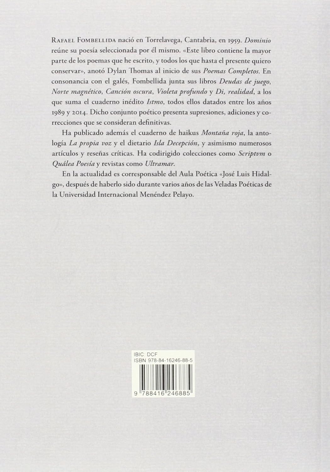 Rafael Fombellida nació en Torrelavega, Cantabria, en 1959. Dominio reúne su poesía seleccionada por él mismo. «Este libro contiene la mayor parte de los poemas que he escrito, y todos los que hasta el presente quiero conservar», anotó Dylan Thomas al inicio de sus Poemas Completos. En consonancia con el galés, Fombellida junta sus libros Deudas de juego, Norte magnético, Canción oscura, Violeta profundo y Di, realidad, a los que suma el cuaderno inédito Istmo, todos ellos datados entre los años 1989 y 2014. Dicho conjunto poético presenta supresiones, adiciones y correcciones que se consideran definitivas. Ha publicado además el cuaderno de haikus Montaña roja, la antología La propia voz y el dietario Isla Decepción, y asimismo numerosos artículos y reseñas críticas. Ha codirigido colecciones como Scriptvm o Quálea Poesía y revistas como Ultramar. En la actualidad es corresponsable del Aula Poética «José Luis Hidalgo», después de haberlo sido durante varios años de las Veladas Poéticas de la Universidad Internacional Menéndez Pelayo.