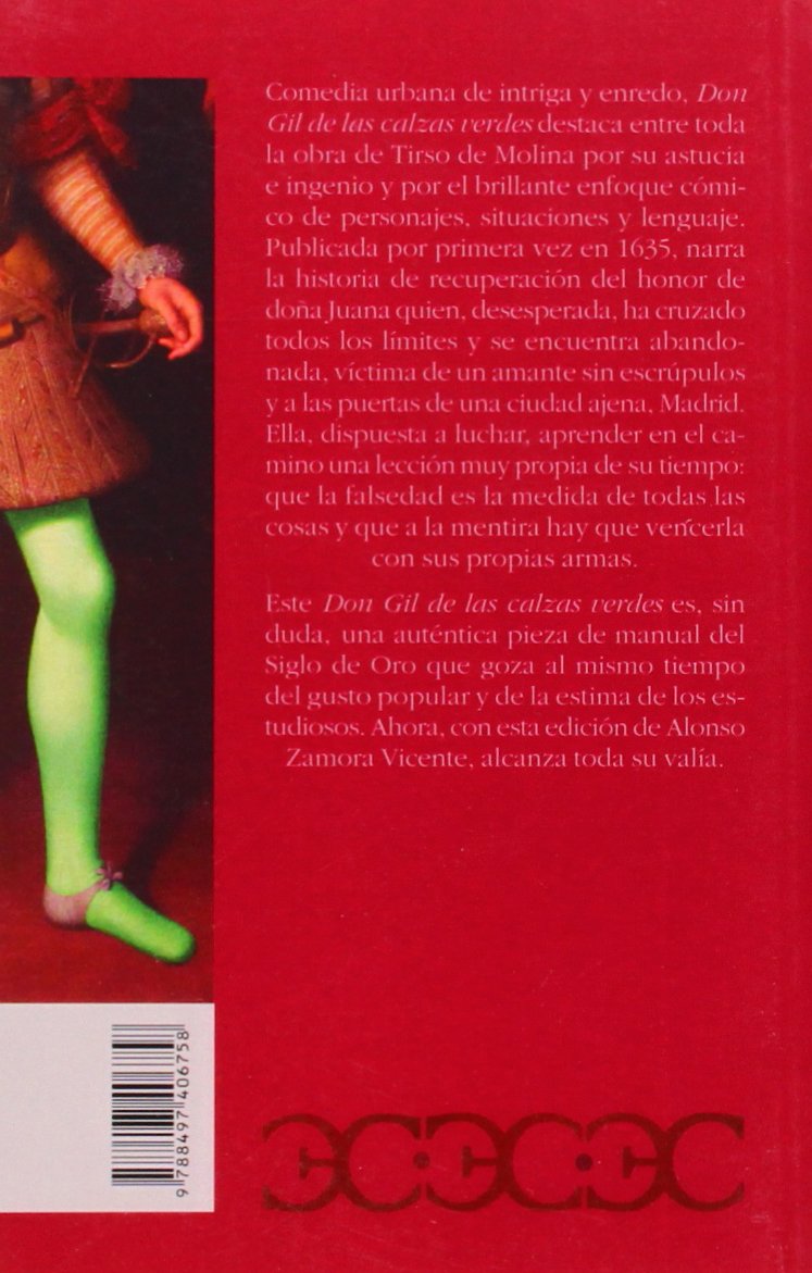 Comedia urbana de intriga y enredo, Don Gilde las calzas verdes destaca entre toda la obra de Tirso de Molina por su astucia e ingenio y por el brillante enfoque cómico de personajes, situaciones y lenguaje. Publicada por primera vez en 1635, narra la historia de recuperación del honor de doña Juana quien, desesperada, ha cruzado todos los límites y se encuentra abandonada, víctima de un amante sin escrúpulos y a las puertas de una ciudad ajena, Madrid. Ella, dispuesta a luchar, aprende en el camino una lección muy de s tiempo: que la falsedad es la medida de todas las cosas y que a la mentira hay que vencerla con sus propias armas, ya que la auténtica verdad sólo resplandece cuando el engaño retira todo su artificio. Una auténtica pieza de manual del Siglo de Oro que goza al mismo tiempo del gusto popular y de la estima de los estudiosos que ahora, con esta edición de Alonso Zamora Vicente, alcanza toda su valía.