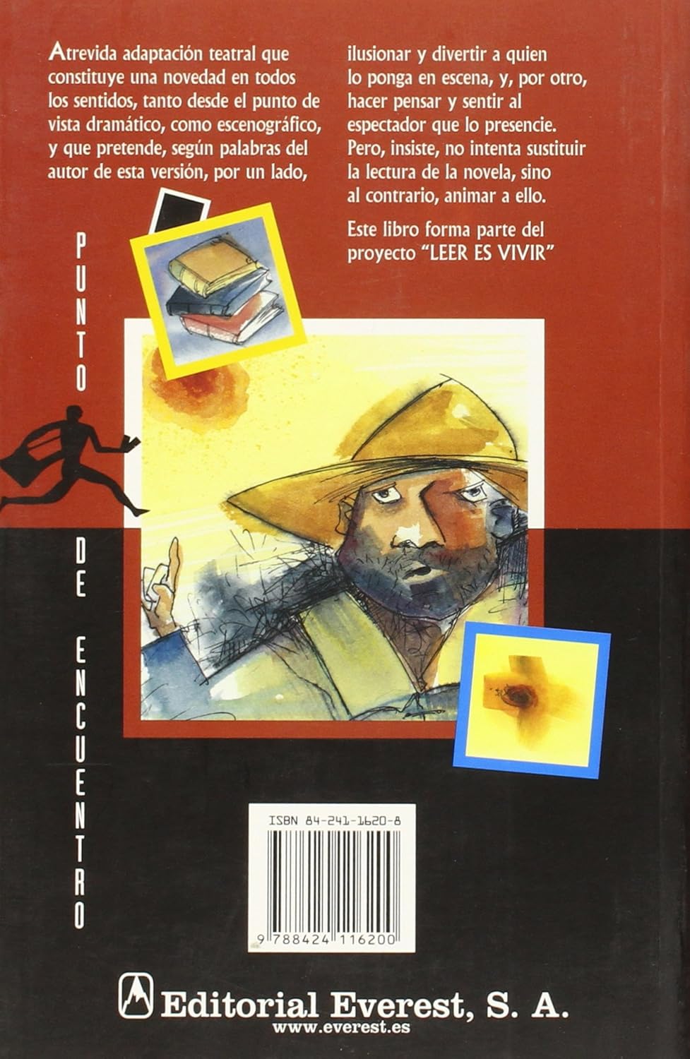 Atrevida adaptación teatral que constituye una novedad en todos los sentidos, tanto desde el punto de vista dramático, como escenográfico. La acción se desarrolla en la época actual, en un centro de Enseñanza Secundaria. Un grupo de estudiantes, coordinados por su profesor, va a representar una versión teatral de la novela de Cervantes, situada en la España de finales del siglo XVI. Sin embargo, esta misma propuesta podría ser utilizada por adultos en ámbitos no académicos o llevarse a cabo por compañías profesionales de manos de las que las sugerencias de puesta en escena cobrarían otra dimensión con medios de producción que permitieran el uso de estructuras más complejas. Dada la extensión de esta versión, el texto aparece dividido en dos partes, al igual que la novela, lo que permite representarla por separado, pues cada una tiene su total unidad. Según palabras del autor de la versión, pretende, por un lado, ilusionar y divertir a quien lo ponga en escena, y, por otro, lograr divertir, hacer pensar y sentir al espectador que lo presencie. Pero, insiste, no intenta sustituir la lectura de la novela, sino, al contrario animar a su lectura. La elegancia de la ilustración hará de su lectura un auténtico placer, y del libro, una verdadera joya.