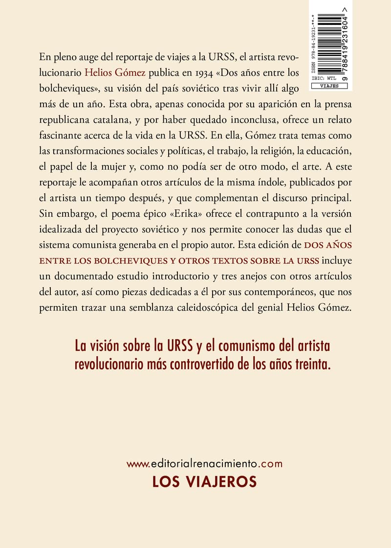 En pleno auge del reportaje de viajes a la URSS, el artista revolucionario Helios Gómez publica en 1934 «Dos años entre los bolcheviques», su visión del país soviético tras vivir allí algo más de un año. Esta obra, apenas conocida por su aparición en la prensa republicana catalana, y por haber quedado inconclusa, ofrece un relato fascinante acerca de la vida en la URSS. En ella, Gómez trata temas como las transformaciones sociales y políticas, el trabajo, la religión, la educación, el papel de la mujer y, como no podía ser de otro modo, el arte. A este reportaje le acompañan otros artículos de la misma índole, publicados por el artista un tiempo después, y que complementan el discurso principal. Sin embargo, el poema épico «Erika» ofrece el contrapunto a la versión idealizada del proyecto soviético y nos permite conocer las dudas que el sistema comunista generaba en el propio autor. Esta edición de Dos años entre los bolcheviques y otros textos sobre la URSS incluye un documentado estudio introductorio y tres anejos con otros artículos del autor, así como piezas dedicadas a él por sus contemporáneos, que nos permiten trazar una semblanza caleidoscópica del genial Helios Gómez. La visión sobre la URSS y el comunismo del artista revolucionario más controvertido de los años treinta. Helios Gómez (Sevilla, 1905-Barcelona, 1956) fue un artista revolucionario que destacó como pintor y dibujante, además de como anarquista. Exiliado en Europa durante la dictadura de Primo de Rivera, se formó en las corrientes vanguardistas de los años veinte y regresó a España con la proclamación de la Segunda República. En la década de 1930 trabajó en la prensa catalana y se pasó a las filas comunistas. Publicó álbumes como Días de ira o Viva Octubre. Durante la guerra civil, fue comisario político y luchó en varios frentes. Se exilió en 1939 y conoció los campos de concentración franceses y del norte de África, para volver a España en 1942. Tras años encarcelado en la Modelo, donde pintó La Capilla Gitana, murió en Barcelona en 1956. Póstumamente, se publicó su obra poética. Esther Lázaro Sanz es Doctora en Filología Española, especialista en exilio republicano, en teatro contemporáneo y en periodismo cultural de la Segunda República, guerra civil y franquismo. Actualmente es investigadora postdoctoral en la Avignon Université. Ha publicado trabajos en revistas especializadas y en obras colectivas, y se ha encargado, entre otras, de las ediciones del monólogo De algún tiempo a esta parte, de Max Aub (Renacimiento, 2018) y de El texto insumiso, de José Sanchis Sinisterra (2018).