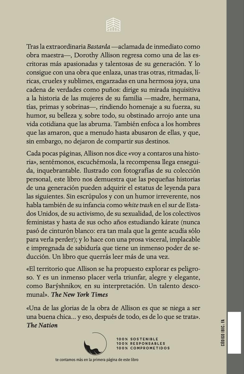 Tras la extraordinaria «Bastarda» ―aclamada de inmediato como obra maestra―, Dorothy Allison regresa como una de las escritoras más apasionadas y talentosas de su generación. Y lo consigue con una obra que enlaza, unas tras otras, ritmadas, líricas, crueles y sublimes, engarzadas en una hermosa joya, una cadena de verdades como puños: dirige su mirada inquisitiva a la historia de las mujeres de su familia ―madre, hermana, tías, primas y sobrinas―, rindiendo homenaje a su fuerza, su humor, su belleza y, sobre todo, su obstinado arrojo ante una vida cotidiana que las abruma. También enfoca a los hombres que las amaron, que a menudo hasta abusaron de ellas, y que, sin embargo, no dejaron de compartir sus destinos. Cada pocas páginas, Allison nos dice «voy a contaros una historia», sentémonos, escuchémosla, la recompensa llega enseguida, inquebrantable. Ilustrado con fotografías de su colección personal, este libro nos demuestra que las pequeñas historias de una generación pueden adquirir el estatus de leyenda para las siguientes. Sin escrúpulos y con un humor irreverente, nos habla también de su infancia como ‘white trash’ en el sur de Estados Unidos, de su activismo, de su sexualidad, de los colectivos feministas y hasta de sus ocho años estudiando kárate (nunca pasó de cinturón blanco: era tan mala que la gente acudía sólo para verla perder); y lo hace con una prosa visceral, implacable e impregnada de sabiduría que tiene un inmenso poder de seducción. Un libro que querrás leer más de una vez.