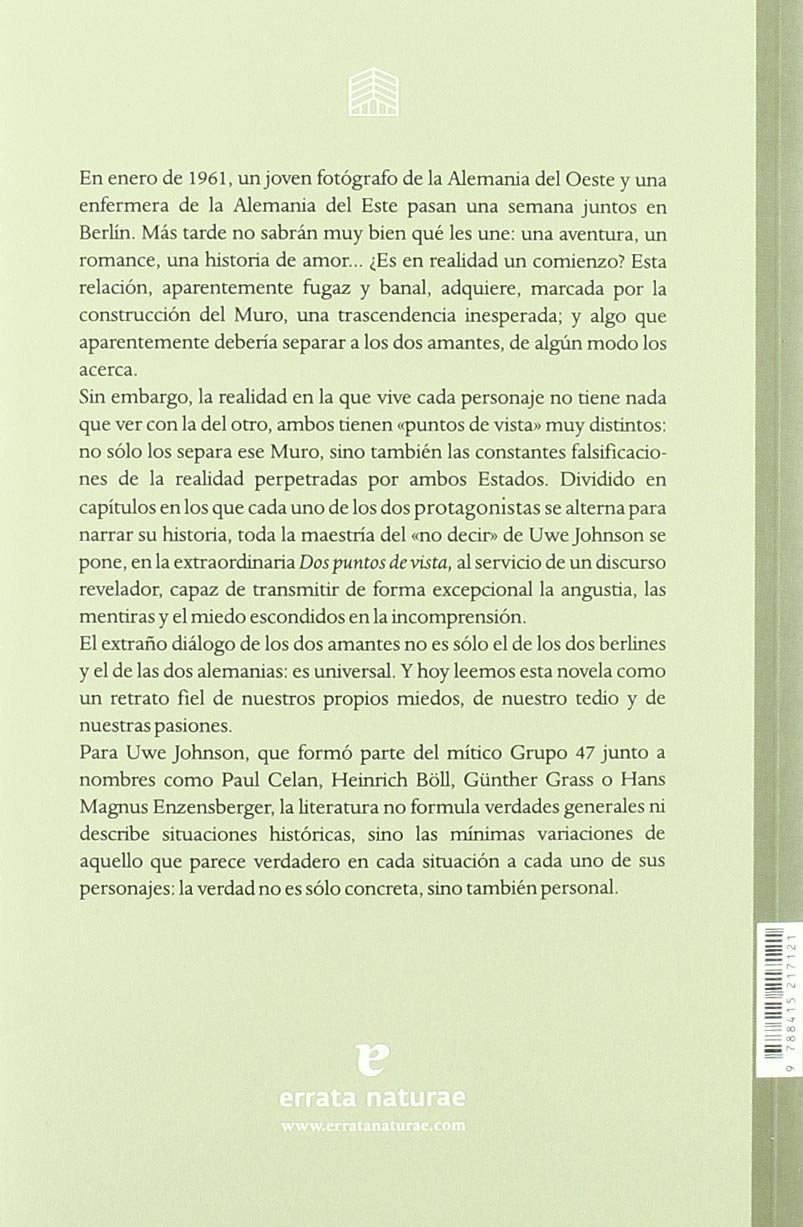 En enero de 1961, un joven fotógrafo de la Alemania del Oeste y una enfermera de la Alemania del Este pasan una semana juntos en Berlín. Más tarde no sabrán muy bien qué les une: una aventura, un romance, una historia de amor… ¿Es en realidad un comienzo? Esta relación, aparentemente fugaz y banal, adquiere, marcada por la construcción del Muro, una trascendencia inesperada; y algo que aparentemente debería separar a los dos amantes, de algún modo los acerca. Sin embargo, la realidad en la que vive cada personaje no tiene nada que ver con la del otro, ambos tienen «puntos de vista» muy distintos: no sólo los separa ese Muro, sino también las constantes falsificaciones de la realidad perpetradas por ambos Estados. Dividido en capítulos en los que cada uno de los dos protagonistas se alterna para narrar su historia, toda la maestría del «no decir» de Uwe Johnson se pone, en la extraordinaria Dos puntos de vista, al servicio de un discurso revelador, capaz de transmitir de forma excepcional la angustia, las mentiras y el miedo escondidos en la incomprensión. El extraño diálogo de los dos amantes no es sólo el de los dos berlines y el de las dos alemanias: es universal. Y hoy leemos esta novela como un retrato fiel de nuestros propios miedos, de nuestro tedio y de nuestras pasiones. Para Uwe Johnson, que formó parte del mítico Grupo 47 junto a nombres como Paul Celan, Heinrich Böll, Günther Grass o Hans Magnus Enzensberger, la literatura no formula verdades generales ni describe situaciones históricas, sino las mínimas variaciones de aquello que parece verdadero en cada situación a cada uno de sus personajes: la verdad no es sólo concreta, sino también personal.