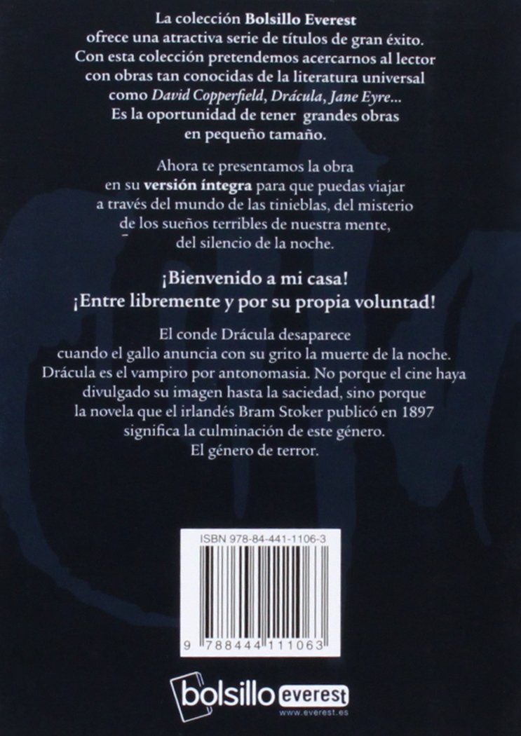 La colección Bolsillo Everest ofrece una atractiva serie de títulos de gran éxito. Con esta colección pretendemos acercarnos al lector con obras tan conocidas de la literatura universal como David Copperfield, Drácula, Jane Eyre… Es la oportunidad de tener grandes obras en pequeño tamaño. El conde Drácuila desaparece cuando el gallo anuncia con su grito la muerte de la noche. Drácula es el vampiro por antonomasia. No porque el cine haya divulgado su imagen hasta la saciedad, sino porque la novela que el irlandés Bram Stoker publicó en 1897 significa la culminación de este género. El género de terror.
