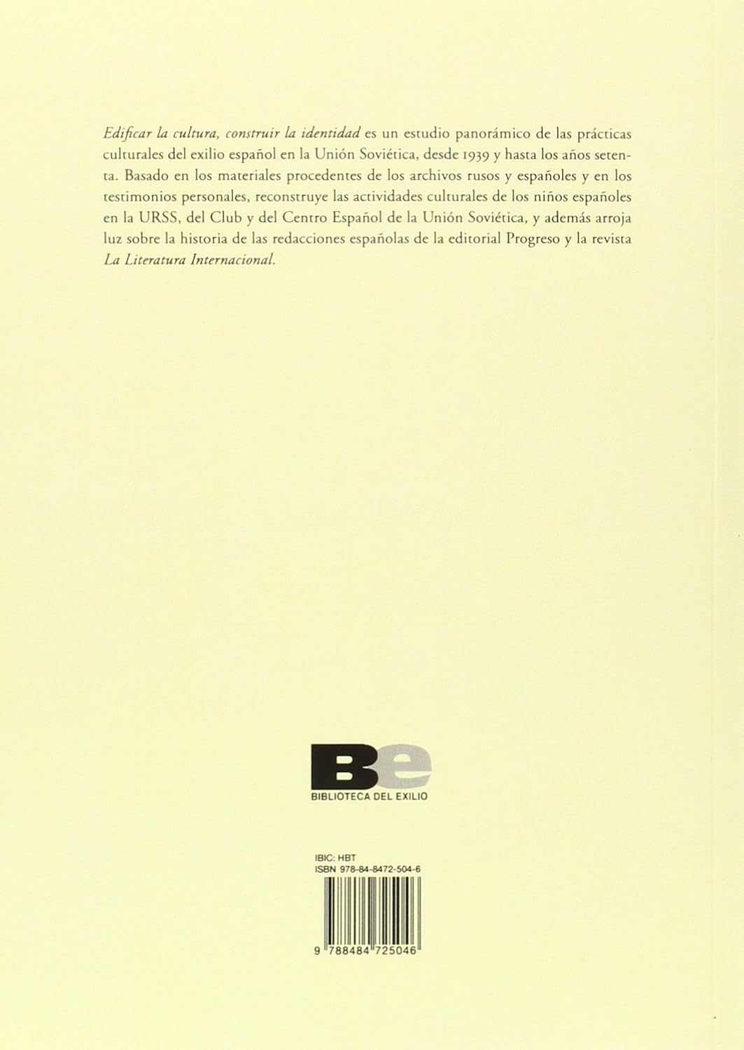 Edificar la cultura, construir la identidad es un estudio panorámico de las prácticas culturales del exilio español en la Unión Soviética, desde 1939 y hasta los años setenta. Basado en los materiales procedentes de los archivos rusos y españoles y en los testimonios personales, reconstruye las actividades culturales de los niños españoles en la URSS, del Club y del Centro Español de la Unión Soviética, y además arroja luz sobre la historia de las redacciones españolas de la editorial Progreso y la revista La Literatura Internacional. Natalia Kharitonova (Moscú, 1972) es doctora en Filología Hispánica por la Universitat Autònoma de Barcelona (UAB). Profesora del Departamento de Filología de la Escuela Superior de Económicas (HSE) de Moscú e investigadora del Departamento de Literatura Contemporánea de Europa y América del Instituto de Literatura Mundial Máximo Gorki de la Academia de Ciencias rusa. Miembro del Grupo de Estudios del Exilio Literario (GEXEL) de la UAB, ha dedicado sus investigaciones a las relaciones literarias y culturales entre Rusia y España, y Cataluña en el siglo XX, especialmente a la revista Octubre, María Teresa León, Andreu Nin y Ramón J. Sender. Ha publicado diversos estudios sobre el exilio republicano español de 1939 en la Unión Soviética, así como la primera edición de Cuentos de Madrid, de César Arconada (Renacimiento, 2007).