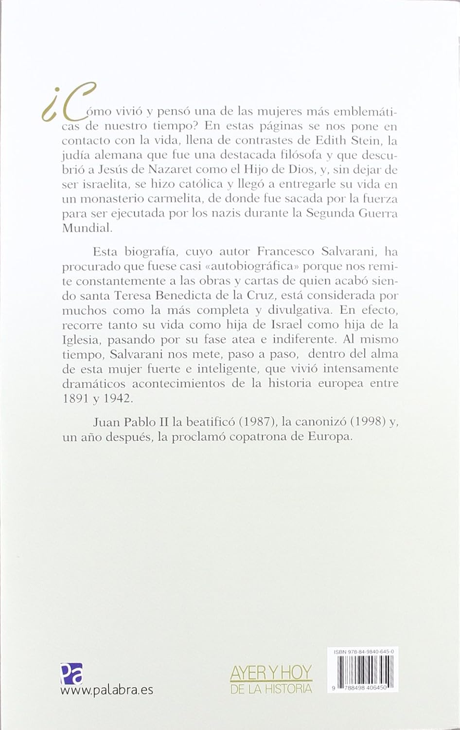 ¿Cómo vivió y pensó una de las mujeres más emblemáticas de nuestro tiempo? En estas páginas se nos pone en contacto con la vida, llena de contrastes de Edith Stein, la judía alemana que fue una destacada filósofa y que descubrió a Jesús de Nazaret como el Hijo de Dios, y, sin dejar de ser israelita, se hizo católica y llegó a entregarle su vida en un monasterio carmelita, de donde fue sacada por la fuerza para ser ejecutada por los nazis durante la Segunda Guerra Mundial.