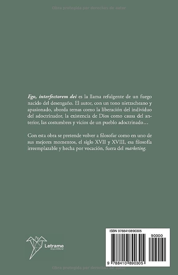 Ego, interfectorem dei es la llama refulgente de un fuego nacido del desengaño. El autor, con un tono nietzscheano y apasionado, aborda temas como la liberación del individuo del adoctrinador, la existencia de Dios como causa del anterior, las costumbres y vicios de un pueblo adoctrinado… Con esta obra se pretende volver a filosofar como en uno de sus mejores momentos, el siglo XVII y XVIII, esa filosofía irreemplazable y hecha por vocación, fuera del marketing.