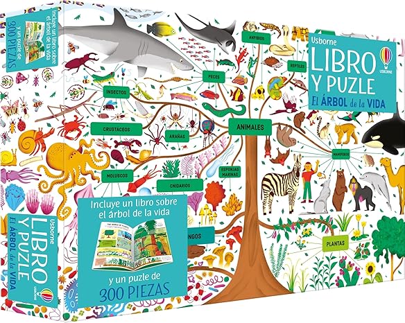 Caja que incluye un puzle del árbol de la vida de 300 piezas y un libro a juego. El gráfico, lleno de color y detalles, ilustra toda la gama de seres vivos, desde bacterias de tamaño microscópico hasta árboles gigantes o tiburones, y los textos ofrecen una gran cantidad de datos curiosos e interesantes.