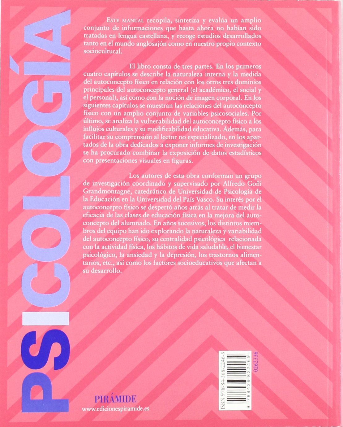 Este manual recopila, sintetiza y evalúa un amplio conjunto de informaciones que hasta ahora no habían sido tratadas en lengua castellana, y recoge estudios desarrollados tanto en el mundo anglosajón como en nuestro propio contexto sociocultural. El libro consta de tres partes. En los primeros cuatro capítulos se describe la naturaleza interna y la medida del autoconcepto físico en relación con los otros tres dominios principales del autoconcepto general (el académico, el social y el personal), así como con la noción de imagen corporal. En los siguientes capítulos se muestran las relaciones del autoconcepto físico con un amplio conjunto de variables psicosociales. Por último, se analiza la vulnerabilidad del autoconcepto físico a los influjos culturales y su modificabilidad educativa. Además, para facilitar su comprensión al lector no especializado, en los apartados de la obra dedicados a exponer informes de investigación se ha procurado combinar la exposición de datos estadísticos con presentaciones visuales en figuras.