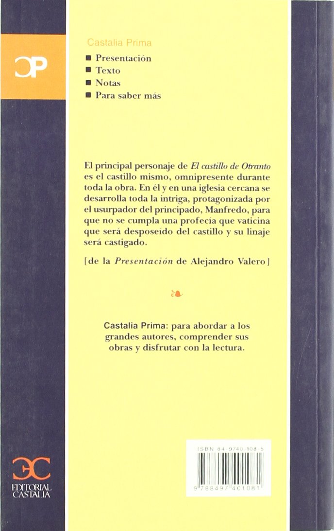 El principal personaje de EL CASTILLO DE OTRANTO es el castillo mismo, omnipresente durante toda la obra. En él y en una iglesia cercana se desarrolla toda la intriga, protagonizada por el usurpador del principado, Manfredo, para que no se cumpla una profecía que vaticina que será desposeído del castillo y su linaje será castigado.Este argumento supone la defensa de una concepción del mundo que se resiste a morir con la llegada de la Ilustración. Esa sociedad medieval de territorios dominados por reyes o príncipes que disponen a su voluntad de criados y vasallos se había extinguido en realidad hacía algunos siglos. Pero la ideología que la sostiene quiere seguir viva para perpetuar una situación insostenible en la que los reyes del siglo XVIII y la nobleza que los apoya (no hay que olvidar que Walpole era conde) controlan el poder y se reparten la tierra.