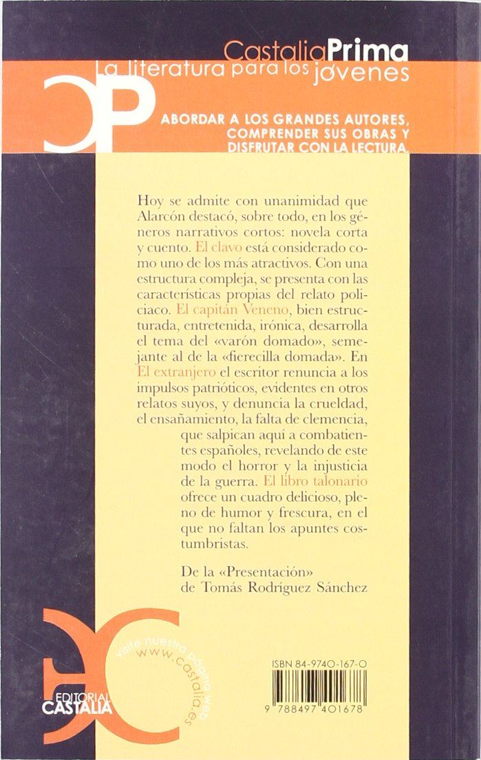 Hoy se admite con unanimidad que Alarcón destacó, sobre todo, en los géneros narrativos cortos: novela corta y cuento. EL CLAVO está considerado como uno de los más atractivos. Con una estructura compleja, se presenta con las características propias del relato policiaco. La historia, según el autor, fue tomada de «una causa célebre que me refirió cierto magistrado granadino cuando yo era muchacho». EL CAPITÁN VENENO, una novela entretenida e irónica, desarrolla un tema de hondas raíces literarias: el «varón domado», en este caso, semejante al de la «fierecilla domada». En EL EXTRANJERO el escritor granadino renuncia a los impulsos patrióticos, evidentes en otros relatos suyos, y denuncia la crueldad, el ensañamiento, la falta de clemencia, que salpican aquí a combatientes españoles, revelando de este modo el horror y la injusticia de la guerra. Finalmente, EL LIBRO TALONARIO ofrece un cuadro delicioso, pleno de humor y frescura, en el que no faltan los apuntes costumbristas.