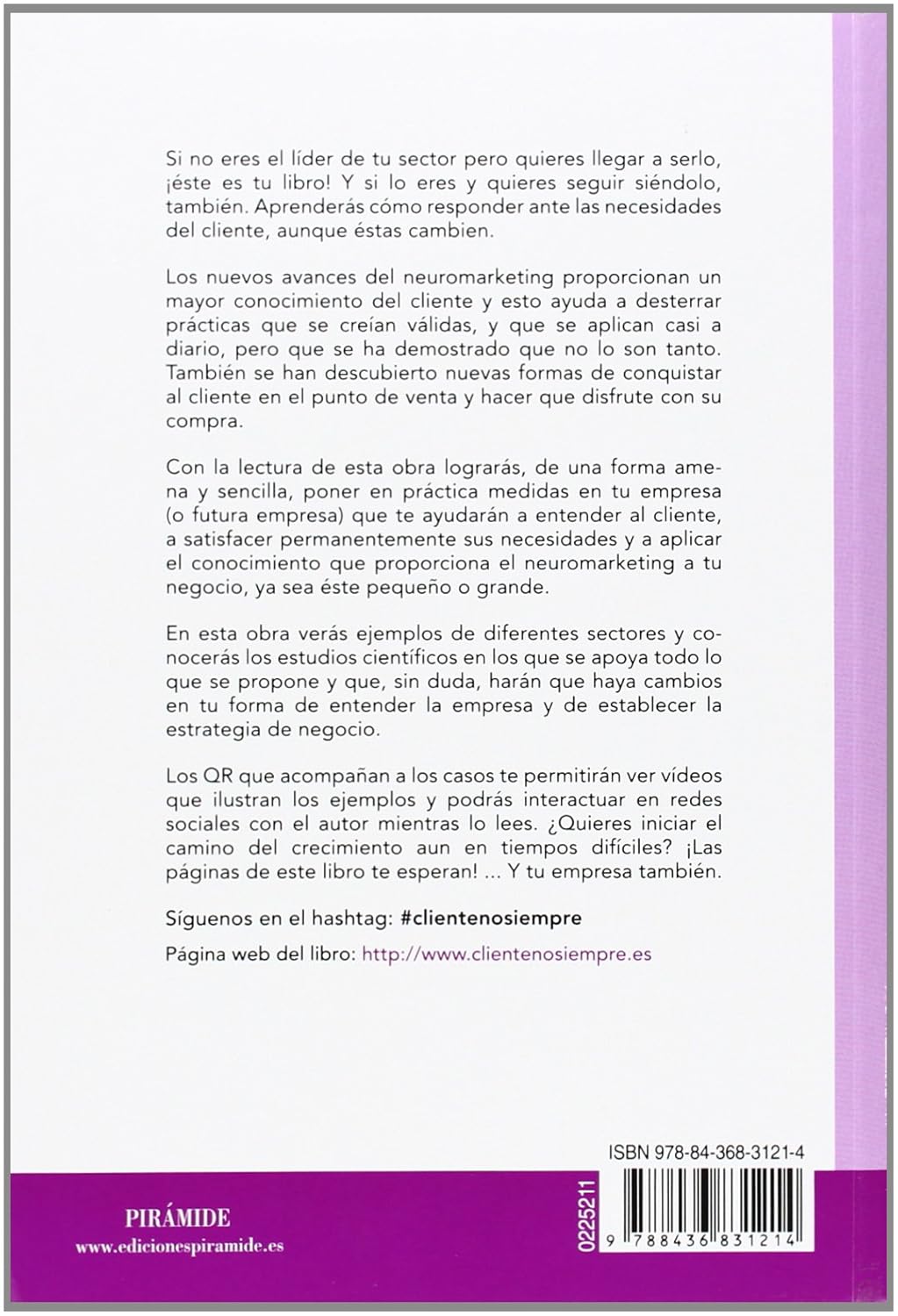 Si no eres el líder de tu sector pero quieres llegar a serlo, ¡éste es tu libro! Y si lo eres y quieres seguir siéndolo, también. Aprenderás cómo responder ante las necesidades del cliente, aunque éstas cambien. Los nuevos avances del neuromarketing proporcionan un mayor conocimiento del cliente y esto ayuda a desterrar prácticas que se creían válidas, y que se aplican casi a diario, pero que se ha demostrado que no lo son tanto. También se han descubierto nuevas formas de conquistar al cliente en el punto de venta y hacer que disfrute con su compra. Con la lectura de esta obra lograrás, de una forma amena y sencilla, poner en práctica medidas en tu empresa (o futura empresa) que te ayudarán a entender al cliente, a satisfacer permanentemente sus necesidades y a aplicar el conocimiento que proporciona el neuromarketing a tu negocio, ya sea éste pequeño o grande. En esta obra verás ejemplos de diferentes sectores y conocerás los estudios científicos en los que se apoya todo lo que se propone y que, sin duda, harán que haya cambios en tu forma de entender la empresa y de establecer la estrategia de negocio. Los QR que acompañan a los casos te permitirán ver vídeos que ilustran los ejemplos y podrás interactuar en redes sociales con el autor mientras lo lees. ¿Quieres iniciar el camino del crecimiento aun en tiempos difíciles? ¡Las páginas de este libro te esperan!… Y tu empresa también. Síguenos en el hashtag: #clientenosiempre Página web del libro: http://www.clientenosiempre.es