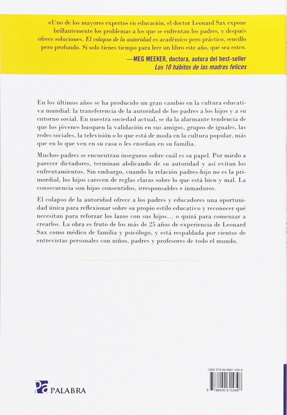 En los últimos años se ha producido un gran cambio en la cultura educativa mundial: la transferencia de la autoridad de los padres a los hijos y a su entorno social. En nuestra sociedad actual, se da la alarmante tendencia de que los jóvenes busquen la validación en sus amigos, grupos de iguales, las redes sociales, la televisión o lo que está de moda en la cultura popular, más que en lo que ven en su casa o les enseñan en su familia. Muchos padres se encuentran inseguros sobre cuál es su papel. Por miedo a parecer dictadores, terminan abdicando de su autoridad y así evitan los enfrentamientos. Sin embargo, cuando la relación padres-hijo no es la primordial, los hijos carecen de reglas claras sobre lo que está bien y mal. La consecuencia son hijos consentidos, irresponsables e inmaduros. El colapso de la autoridad ofrece a los padres y educadores una oportunidad única para reflexionar sobre su propio estilo educativo y reconocer qué necesitan para reforzar los lazos con sus hijos… o quizá para comenzar a crearlos. La obra es fruto de los más de 25 años de experiencia de Leonard Sax como médico de familia y psicólogo, y está respaldada por cientos de entrevistas personales con niños, padres y profesores de todo el mundo. “Uno de los mayores expertos en educación, el doctor Leonard Sax expone brillantemente los problemas a los que se enfrentan los padres, y después ofrece soluciones. El colapso de la autoridad es académico pero práctico, sencillo pero profundo. Si solo tienes tiempo para leer un libro este año, que sea este”. -MEG MEEKER, doctora, autora del best-seller Los 10 hábitos de las madres felices