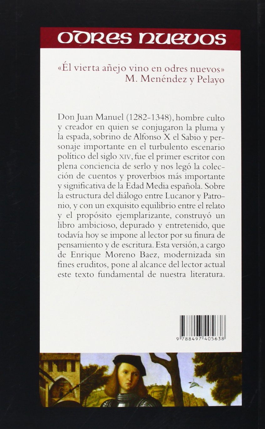 Don Juan Manuel (1282-1348), hombre culto y creador en quien se conjugaron la pluma y la espada, sobrino de Alfonso X el Sabio y personaje importante en el turbulento escenario político del siglo XIV, fue el primer escritor con plena conciencia de serlo y nos legó la colección de cuentos más importante y significativa de la Edad Media española. Sobre la estructura del diálogo entre Lucanor y Patronio, y con un exquisito equilibrio entre el relato y el próposito ejemplarizante, construyó un libro ambicioso, depurado y entretenido, que todavía hoy se impone al lector por su finura de pensamiento y de escritura. Esta versión, a cargo de Enrique Moreno Báez, modernizada sin fines eruditos, pone al alcance del lector actual este texto fundamental de nuestra literatura. “Él vierta añejo vino en odres nuevos”, M. Menéndez Pelayo LAS OBRAS MÁS IMPORTANTES DE LA LITERATURA CASTELLANA MEDIEVAL SE HAN VERTIDO AL LENGUAJE ESPAÑOL MODERNO PARA PONERLAS AL ALCANCE DE TODOS LOS LECTORES.