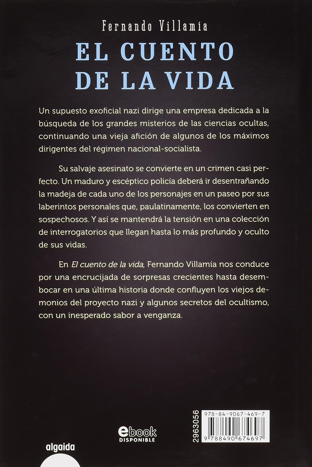 Un supuesto exoficial nazi dirige una empresa dedicada a la búsqueda de los grandes misterios de las ciencias ocultas, continuando una vieja afición de algunos de los máximos dirigentes del régimen nacional-socialista. Su salvaje asesinato se convierte en un crimen casi perfecto. Un maduro y escéptico policía deberá ir desentrañando la madeja de cada uno de los personajes en un paseo por sus laberintos personales que, paulatinamente, los convierten en sospechosos. Y así se mantendrá la tensión en una colección de interrogatorios que llegan hasta lo más profundo y oculto de sus vidas. En El cuento de la vida, Fernando Villamía nos conduce por una encrucijada de sorpresas crecientes hasta desembocar en una última historia, donde confluyen los viejos demonios del proyecto nazi y algunos secretos del ocultismo, con un inesperado sabor a venganza.