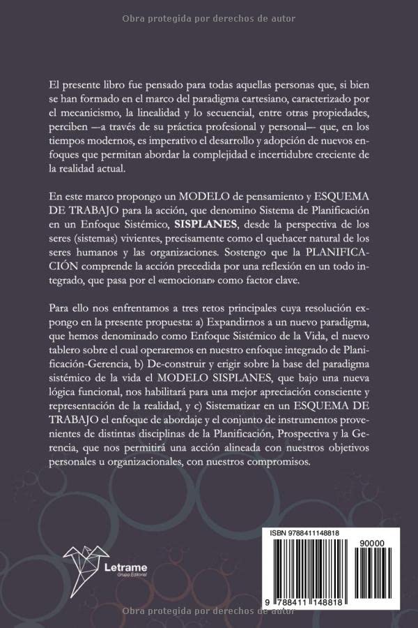 El presente libro fue pensado para todas aquellas personas que, si bien se han formado en el marco del paradigma cartesiano, caracterizado por el mecanicismo, la linealidad y lo secuencial, entre otras propiedades, perciben –-a través de su práctica profesional y personal–- que, en los tiempos modernos, es imperativo el desarrollo y adopción de nuevos enfoques que permitan abordar la complejidad e incertidubre creciente de la realidad actual.En este marco propongo un MODELO de pensamiento y ESQUEMA DE TRABAJO para la acción, que denomino Sistema de Planificación en un Enfoque Sistémico, SISPLANES, desde la perspectiva de los seres (sistemas) vivientes, precisamente como el quehacer natural de los seres humanos y las organizaciones. Sostengo que la PLANIFICACIÓN comprende la acción precedida por una reflexión en un todo integrado, que pasa por el «emocionar» como factor clave.Para ello nos enfrentamos a tres retos principales cuya resolución expongo en la presente propuesta: a) Expandirnos a un nuevo paradigma, que hemos denominado como Enfoque Sistémico de la Vida, el nuevo tablero sobre el cual operaremos en nuestro enfoque integrado de Planificación-Gerencia, b) De-construir y erigir sobre la base del paradigma sistémico de la vida el MODELO SISPLANES, que bajo una nueva lógica funcional, nos habilitará para una mejor apreciación consciente y representación de la realidad, y c) Sistematizar en un ESQUEMA DE TRABAJO el enfoque de abordaje y el conjunto de instrumentos provenientes de distintas disciplinas de la Planificación, Prospectiva y la Gerencia, que nos permitirá una acción alineada con nuestros objetivos personales u organizacionales, con nuestros compromisos.