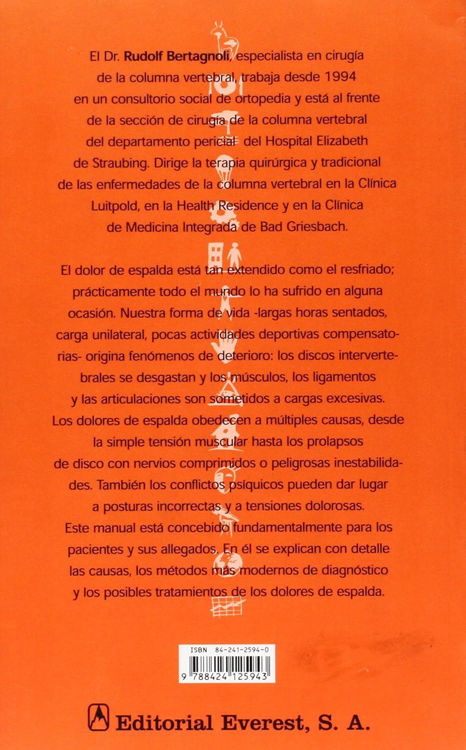 El dolor de espalda está tan extendido como el resfriado; prácticamente todo el mundo lo ha sufrido en alguna ocasión. Nuestra forma de vida origina fenómenos de deterioro. Los dolores de espalda obedecen a múltiples causas, desde la la simple tensión muscular hasta los prolapsos de disco con nervios comprimidos o peligrosas inestabilidades. Este manual está concebido principalmente para los pacientes y sus alegados.