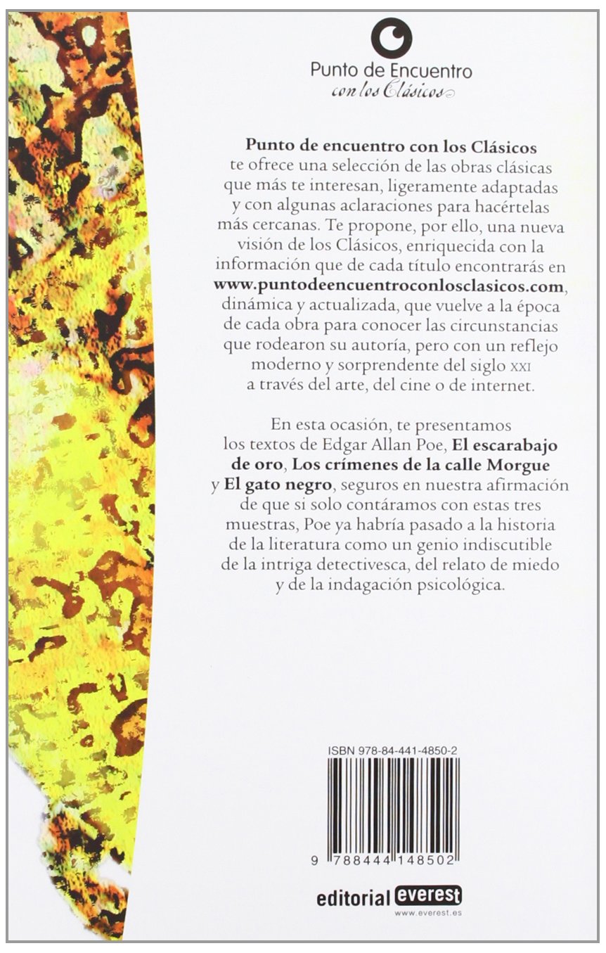 Punto de encuentro con los Clásicos te ofrece una selección de las obras clásicas que más te interesan, ligeramente adaptadas y con algunas aclaraciones para hacértelas más cercanas. Te propone, por ello, una nueva visión de los Clásicos, enriquecida con la información que de cada título encontrarás en www.puntodeencuentroconlosclasicos.com, dinámica y actualizada, que vuelve a la época de cada obra para conocer las circunstancias que rodearon su autoría, pero con un reflejo moderno y sorprendente del siglo XXI a través del arte, del cine o de internet. En esta ocasión te presentamos los textos de Edgar Allan Poe, El escarabajo de oro, Los crímenes de la calle Morgue y El gato negro, seguros en nuestra afirmación de que si solo contáramos con estas tres muestras, Poe ya habría pasado a la historia de la literatura como un genio indiscutible de la intriga detectivesca, del relato de miedo y de la indagación psicológica.