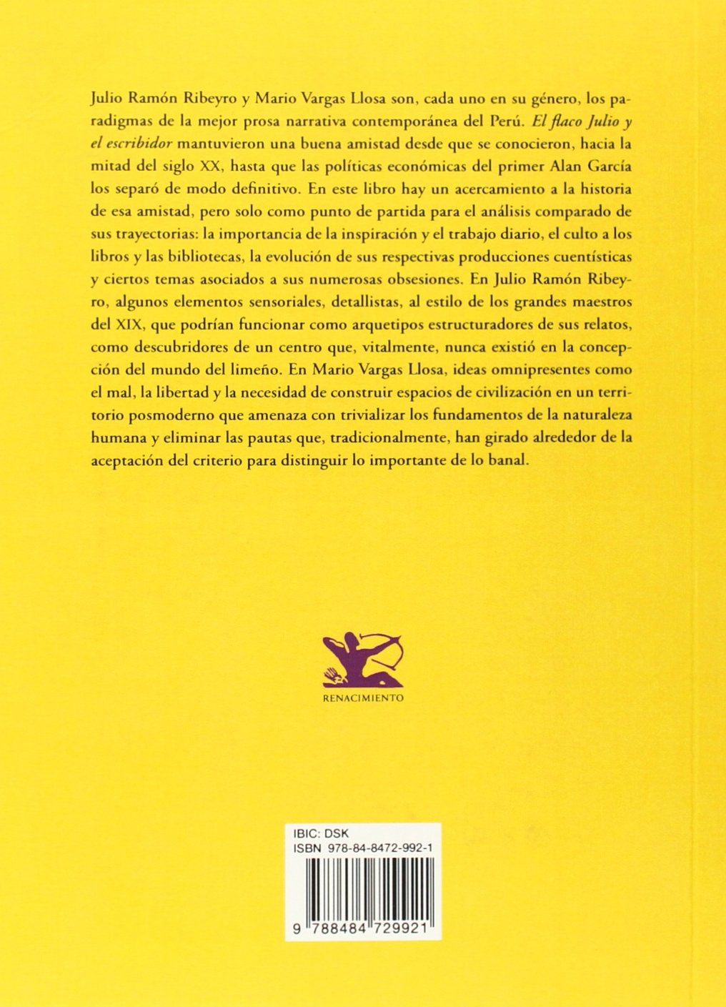 Julio Ramón Ribeyro y Mario Vargas Llosa son, cada uno en su género, los paradigmas de la mejor prosa narrativa contemporánea del Perú. El flaco Julio y el escribidor mantuvieron una buena amistad desde que se conocieron, hacia la mitad del siglo XX, hasta que las políticas económicas del primer Alan García los separó de modo definitivo. En este libro hay un acercamiento a la historia de esa amistad, pero solo como punto de partida para el análisis comparado de sus trayectorias: la importancia de la inspiración y el trabajo diario, el culto a los libros y las bibliotecas, la evolución de sus respectivas producciones cuentísticas y ciertos temas asociados a sus numerosas obsesiones. En Julio Ramón Ribeyro, algunos elementos sensoriales, detallistas, al estilo de los grandes maestros del XIX, que podrían funcionar como arquetipos estructuradores de sus relatos, como descubridores de un centro que, vitalmente, nunca existió en la concepción del mundo del limeño. En Mario Vargas Llosa, ideas omnipresentes como el mal, la libertad y la necesidad de construir espacios de civilización en un territorio posmoderno que amenaza con trivializar los fundamentos de la naturaleza humana y eliminar las pautas que, tradicionalmente, han girado alrededor de la aceptación del criterio para distinguir lo importante de lo banal.