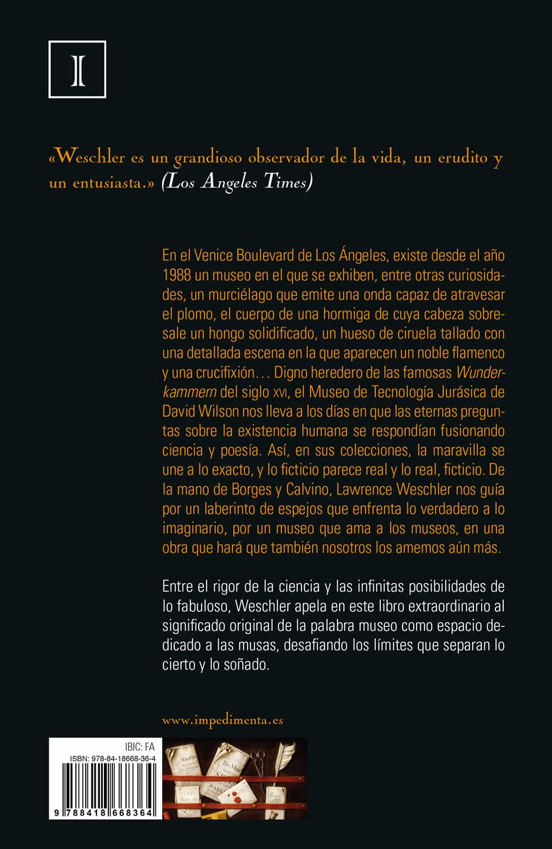 Finalista del Premio Pulitzer y del National Book Critics Circle Award. Un artefacto literario sorprendente que celebra la tradición de lo maravilloso en nuestra cultura.Hormigas hediondas de cuyo cerebro sale un hongo mortal, humanos cornudos, tostadas de ratón… Estas son algunas de las cosas que pueden encontrarse expuestas en el Museo de Tecnología Jurásica de David Wilson, un lugar escondido en el West Side de Los Ángeles que nos pone en contacto con nuestro innato sentido de la maravilla haciendo que nos preguntemos cuáles de los singulares artefactos allí exhibidos son reales y cuáles no. En «El Gabinete de las Maravillas de Mr. Wilson» Lawrence Weschler rebusca entre los ecos de las «Wunderkammern» del siglo XVI y nos guía, de la mano de Borges y de Calvino, a través de una sala de espejos que se mueve entre el rigor de la ciencia y la ficción del arte, yuxtaponiendo lo auténtico y lo fantástico, lo verdadero y lo imaginario que hay en todo museo.CRÍTICAS«Lawrence Weschler se ha aventurado en la extraña y turbia zona entre lo real y lo imaginario y demuestra ser un excelente guía, persuadiéndonos a seguirlo con la pura fuerza de su ingenio y un incansable sentido del asombro.» ―Paul Auster«Encuentro este libro apasionante. Weschler revela una manifestación del vasto movimiento de descubrimiento y prodigio que creó los primeros museos, así como ese impetuoso estado mental que constituyó el preludio de la ciencia moderna.» ―Oliver Sacks«Weschler es un grandioso observador de la vida, un erudito y un entusiasta.» ―Los Angeles Times«Una brillante reflexión sobre la creatividad humana.» ―New York magazine«Weschler es un tesoro nacional cuyas perspectivas e intereses profundamente descentrados aportan un nuevo significado a la idea del placer de la lectura.» ―The Bloomsbury Review«Weschler escribe tan bien que inspira envidia.» ―The New York Observer«No conozco escritor con un entusiasmo más crudo y contagioso por el mundo.» ―LA Weekly
