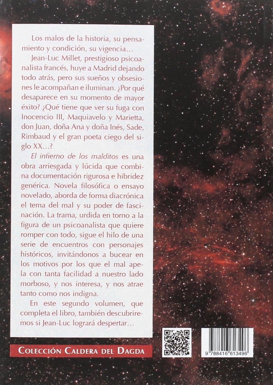 Los malos de la historia, su pensamiento y condición, su vigencia Jean-Luc Millet, prestigioso psicoanalista francés, huye a Madrid dejando todo atrás, pero sus sueños y obsesiones le acompañan e iluminan. ¿Por qué desaparece en su momento de mayor éxito? ¿Qué tiene que ver su fuga con Inocencio III, Maquiavelo y Marietta, don Juan, doña Ana y doña Inés, Sade, Rimbaud y el gran poeta ciego del siglo XX ? El infierno de los malditos es una obra arriesgada y lúcida que combina documentación rigurosa e hibridez genérica. Novela filosófica o ensayo novelado, aborda de forma diacrónica el tema del mal y su poder de fascinación. La trama, urdida en torno a la figura de un psicoanalista que quiere romper con todo, sigue el hilo de una serie de encuentros con personajes históricos, invitándonos a bucear en los motivos por los que el mal apela con tanta facilidad a nuestro lado morboso, y nos interesa, y nos atrae tanto como nos indigna. En este segundo volumen, que completa el libro, también descubriremos si Jean-Luc logrará despertar