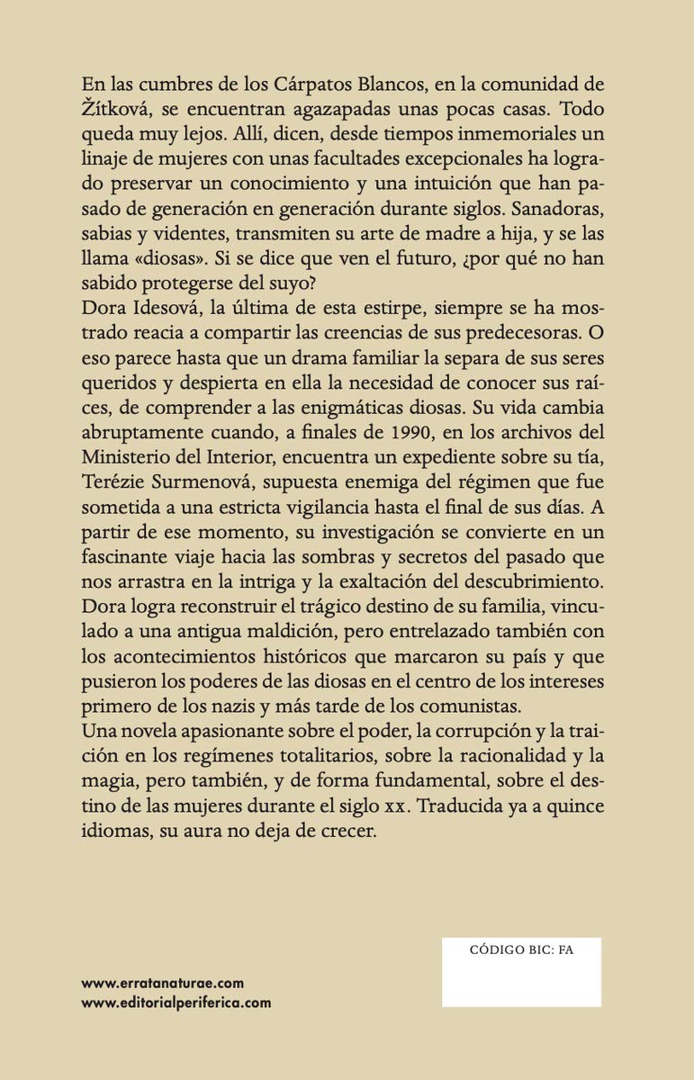 En las cumbres de los Cárpatos Blancos, en la comunidad de Žítková, se encuentran agazapadas unas pocas casas. Todo queda muy lejos. Allí, dicen, desde tiempos inmemoriales un linaje de mujeres con unas facultades excepcionales ha logrado preservar un conocimiento y una intuición que han pasado de generación en generación durante siglos. Sanadoras, sabias y videntes, transmiten su arte de madre a hija, y se las llama «diosas». Si se dice que ven el futuro, ¿por qué no han sabido protegerse del suyo? Dora Idesová, la última de esta estirpe, siempre se ha mostrado reacia a compartir las creencias de sus predecesoras. O eso parece hasta que un drama familiar la separa de sus seres queridos y despierta en ella la necesidad de conocer sus raíces, de comprender a las enigmáticas diosas. Su vida cambia abruptamente cuando, a finales de 1990, en los archivos del Ministerio del Interior, encuentra un expediente sobre su tía, Terézie Surmenová, supuesta enemiga del régimen que fue sometida a una estricta vigilancia hasta el final de sus días. A partir de ese momento, su investigación se convierte en un fascinante viaje hacia las sombras y secretos del pasado que nos arrastra en la intriga y la exaltación del descubrimiento. Dora logra reconstruir el trágico destino de su familia, vinculado a una antigua maldición, pero entrelazado también con los acontecimientos históricos que marcaron su país y que pusieron los poderes de las diosas en el centro de los intereses primero de los nazis y más tarde de los comunistas. Una novela apasionante sobre el poder, la corrupción y la traición en los regímenes totalitarios, sobre la racionalidad y la magia, pero también, y de forma fundamental, sobre el destino de las mujeres durante el siglo xx. Traducida ya a quince idiomas, su aura no deja de crecer.
