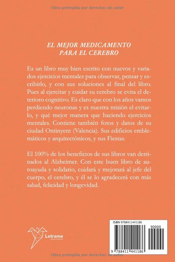 Es un libro muy bien escrito con nuevos y variados ejercicios mentales para observar, pensar y escribirlo, y con sus soluciones al final del libro. Pues al ejercitar y cuidar su cerebro se evita el deterioro cognitivo. Es claro que con los años vamos perdiendo neuronas y es nuestra misión el evitarlo, y qué mejor manera que haciendo ejercicios mentales. Contiene también fotos y datos de su ciudad Ontinyent (Valencia). Sus edificios emblemáticos y arquitectónicos, y sus Fiestas.El 100% de los beneficios de sus libros van destinados al Alzheimer. Con este buen libro de autoayuda y solidario, cuidará y mejorará al jefe del cuerpo, el cerebro, y él se lo agradecerá con más salud, felicidad y longevidad.